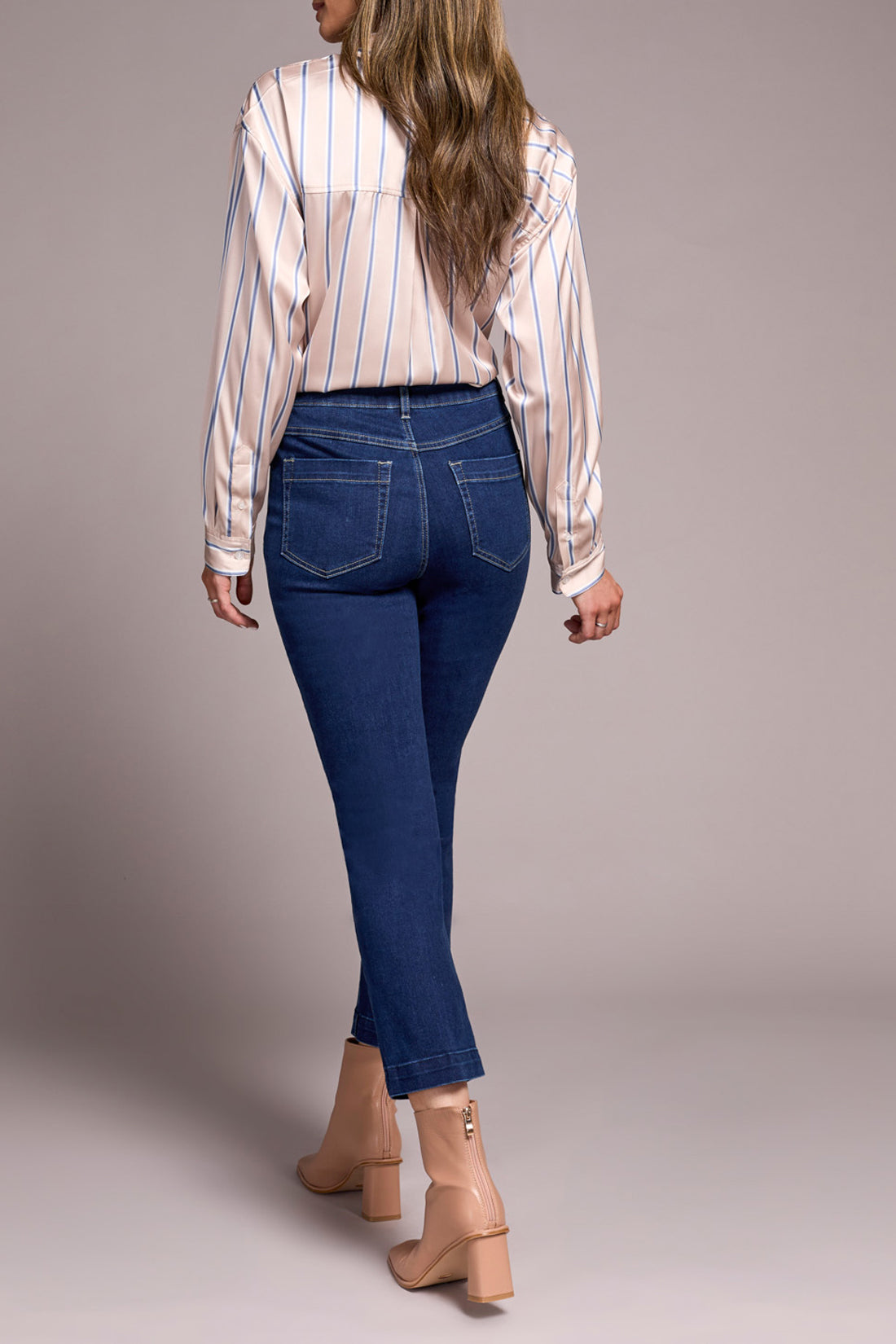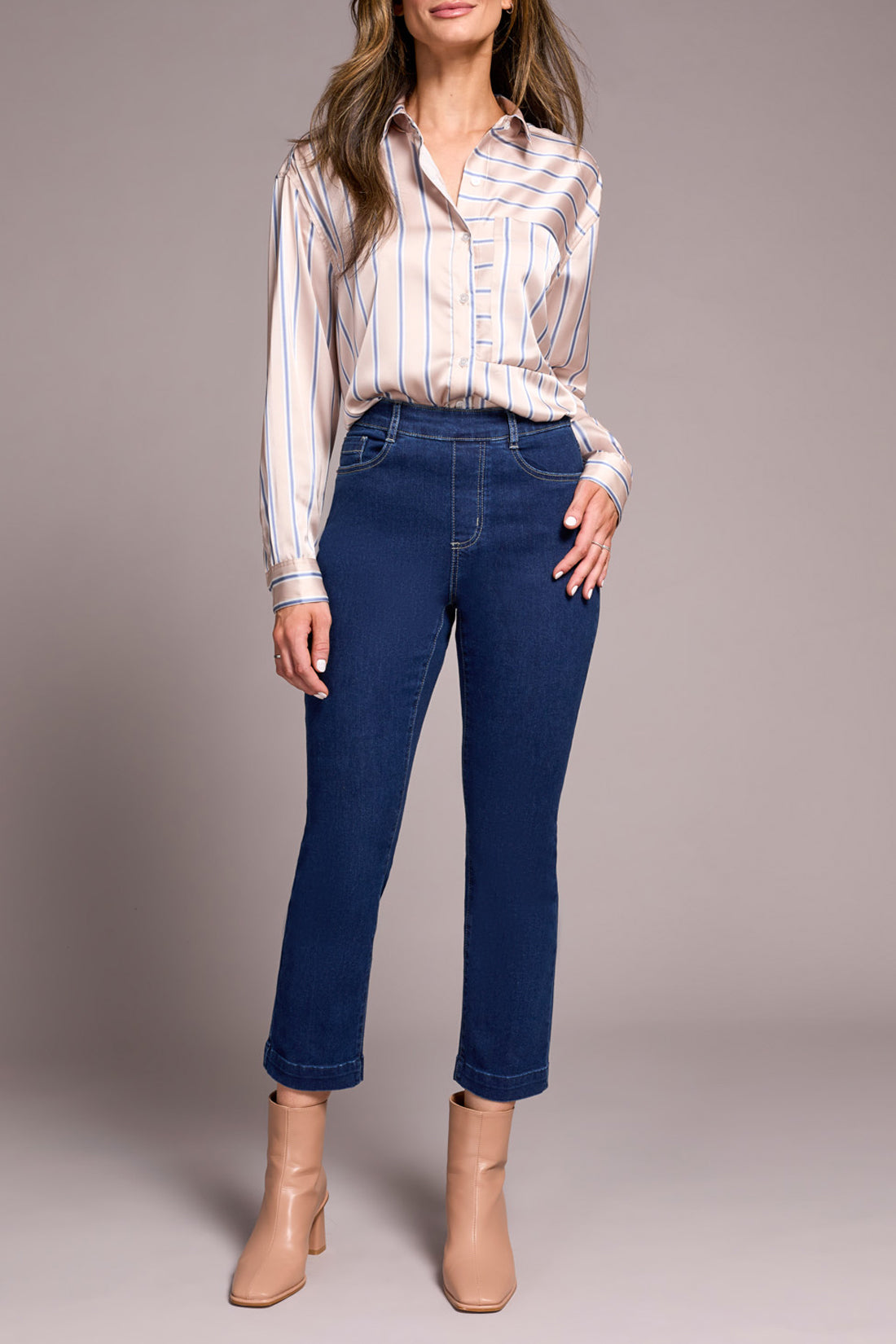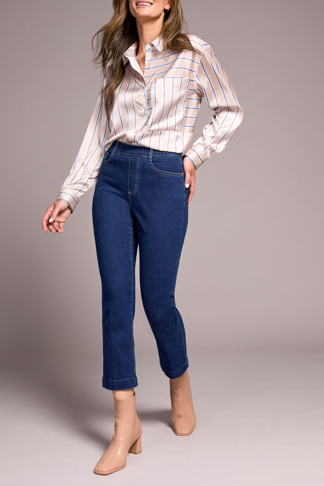 Go for poised style in denim in these mid rise jeans defined by a classic straight leg cut with an elegant crease accent along the leg. The stretch denim promises all-day comfort and keeps the pull-on style easy to slip into while the pockets offer practicality without compromising style.