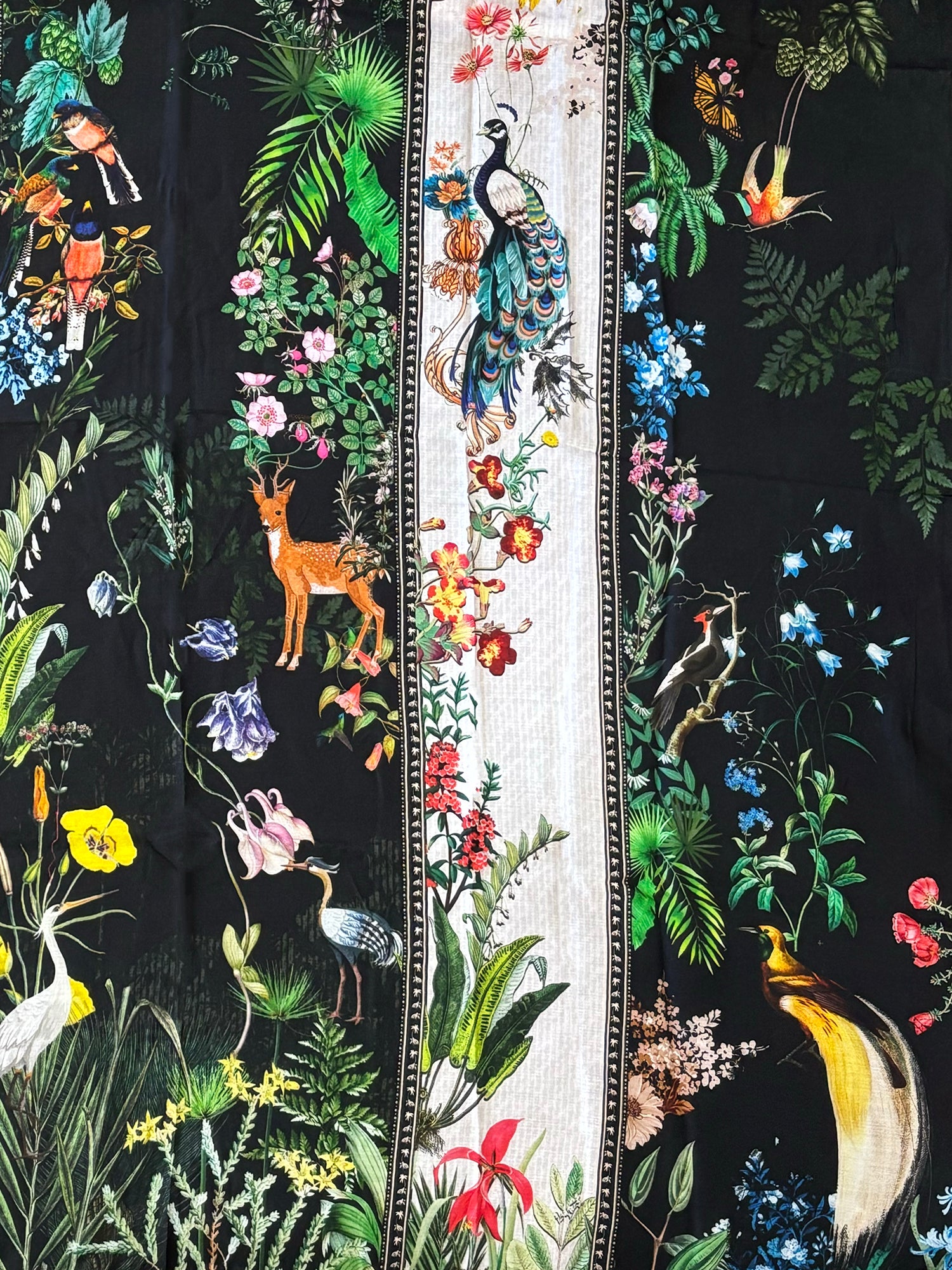 The Forest Buttoned Dress made from Viscose Twill.  Stunning colours and a gorgeous digital pattern throughout.