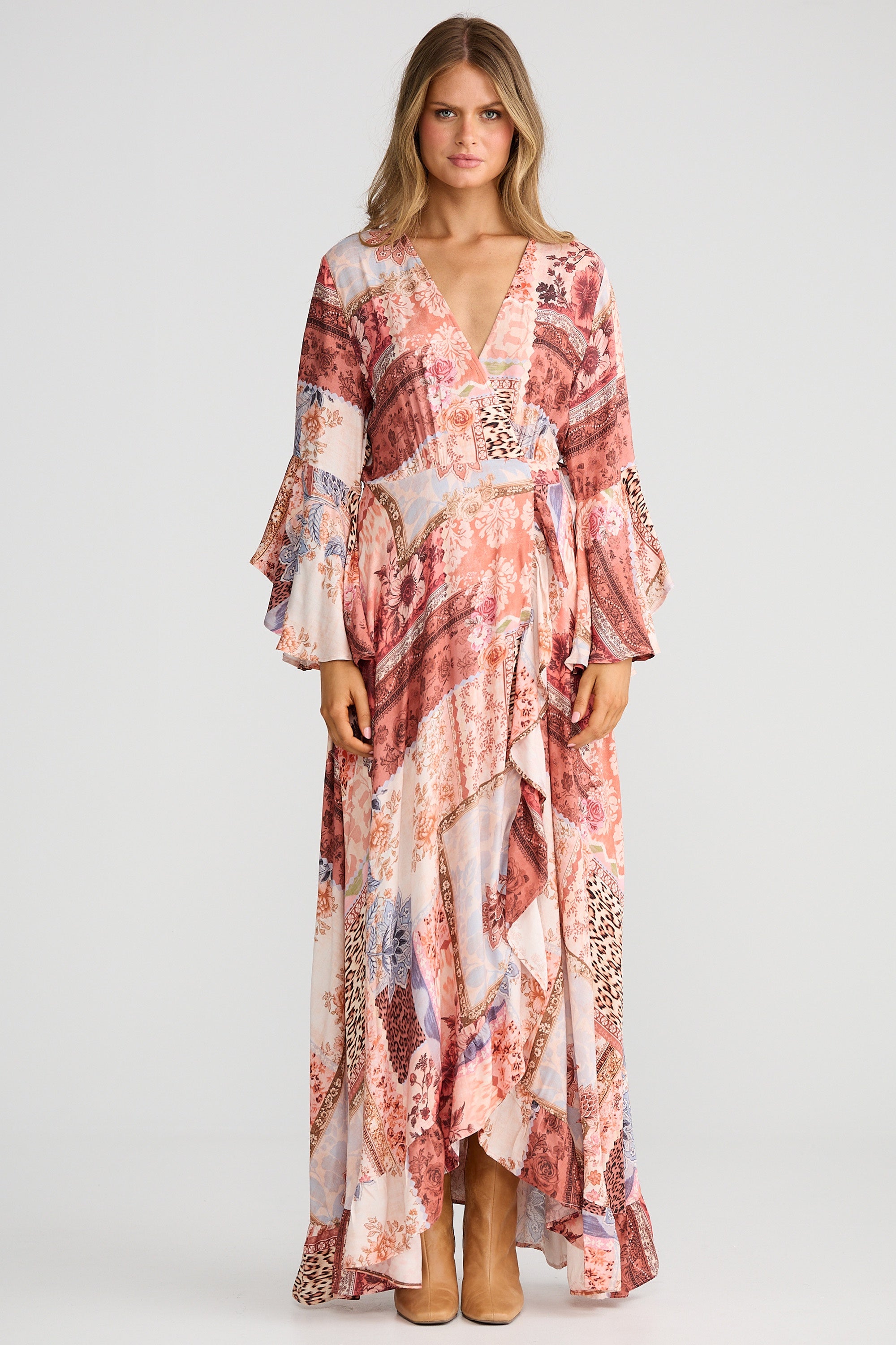 This maxi dress from Talisman the Label is designed in a figure-skimming, wrapped silhouette with a true wrap style and side tie closure. It features a surplice V-neck, floral print and three-quarter frill sleeves.