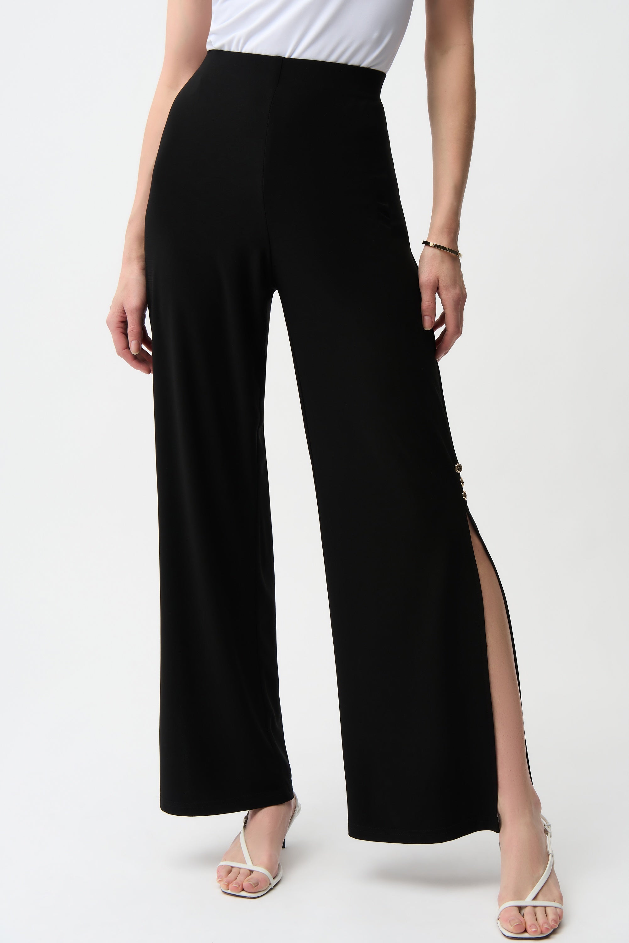 Polished yet easy, these silky knit pants feature fluid wide legs and gold-trimmed side slits. A soft covered elastic waistband ensures comfort from day to night.