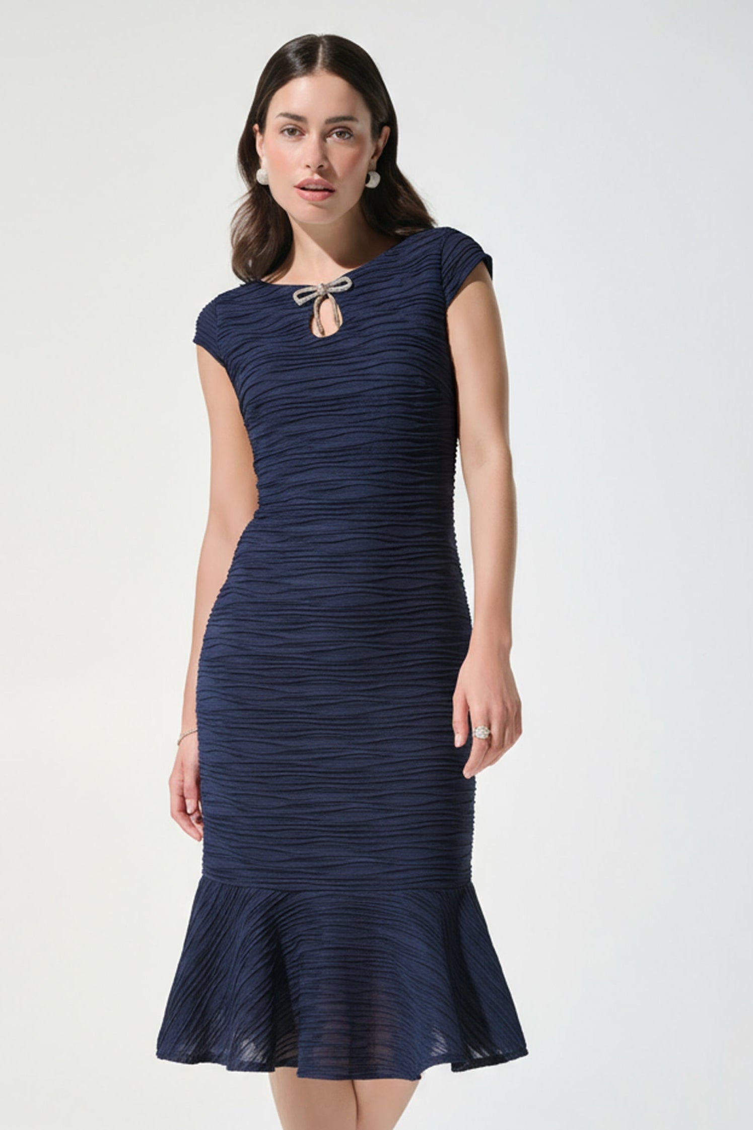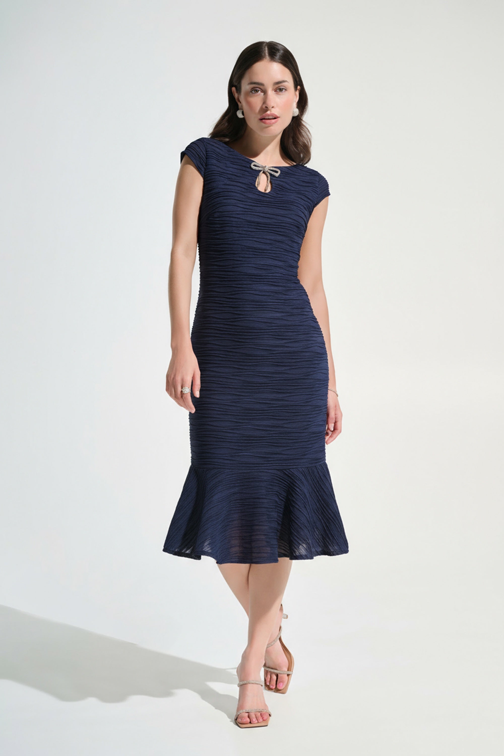 Shimmering lurex cascades into a graceful flounce silhouette, this dress designed with short cap sleeves and a keyhole neckline. A rhinestone bow detail adds sparkle, while its below-the-knee length offers a polished finish for elegant occasions.