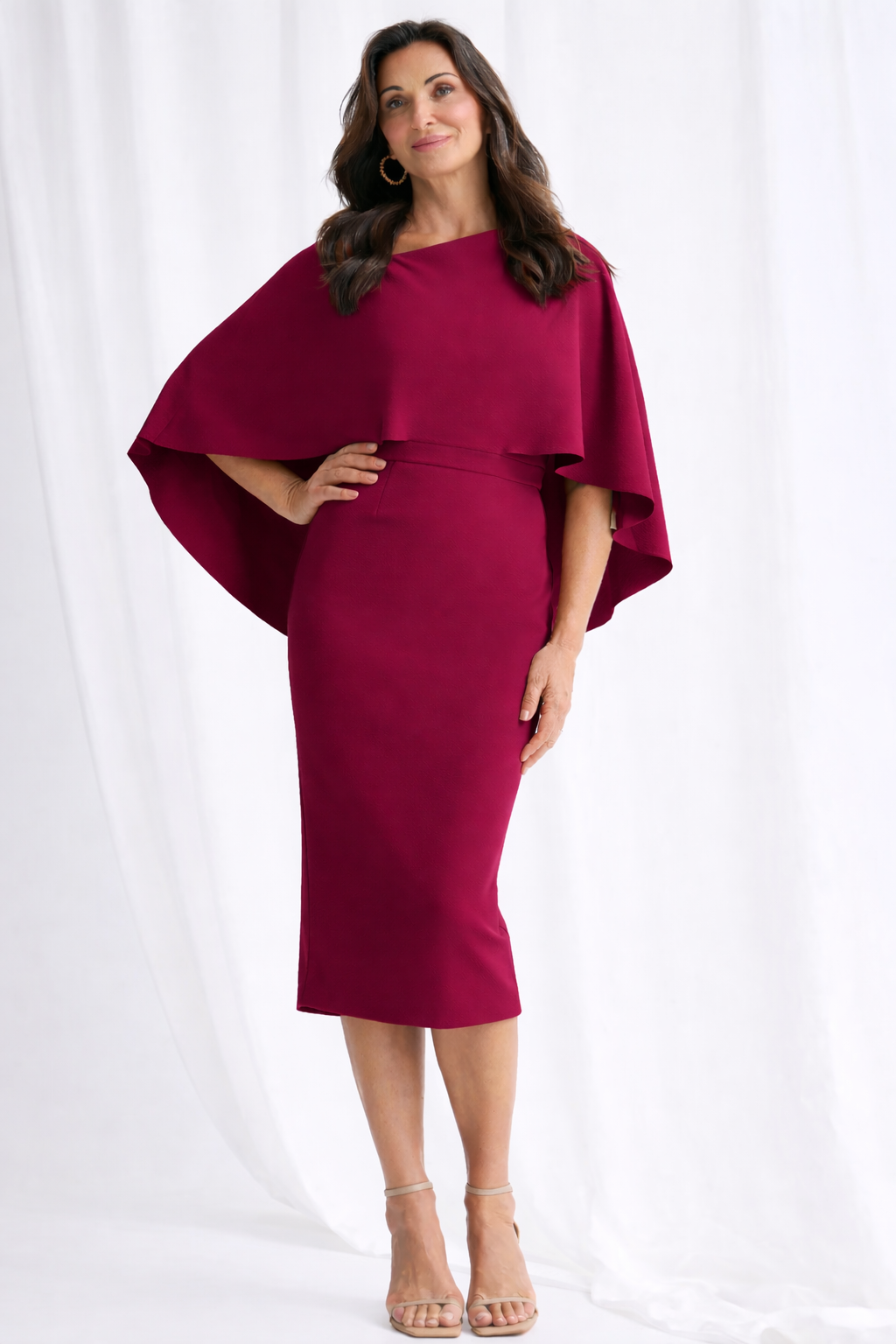 A gorgeous midi dress by Trellis Lane. A flattering design featuring an asymmetric neckline, cape sleeves and pencil skirt.