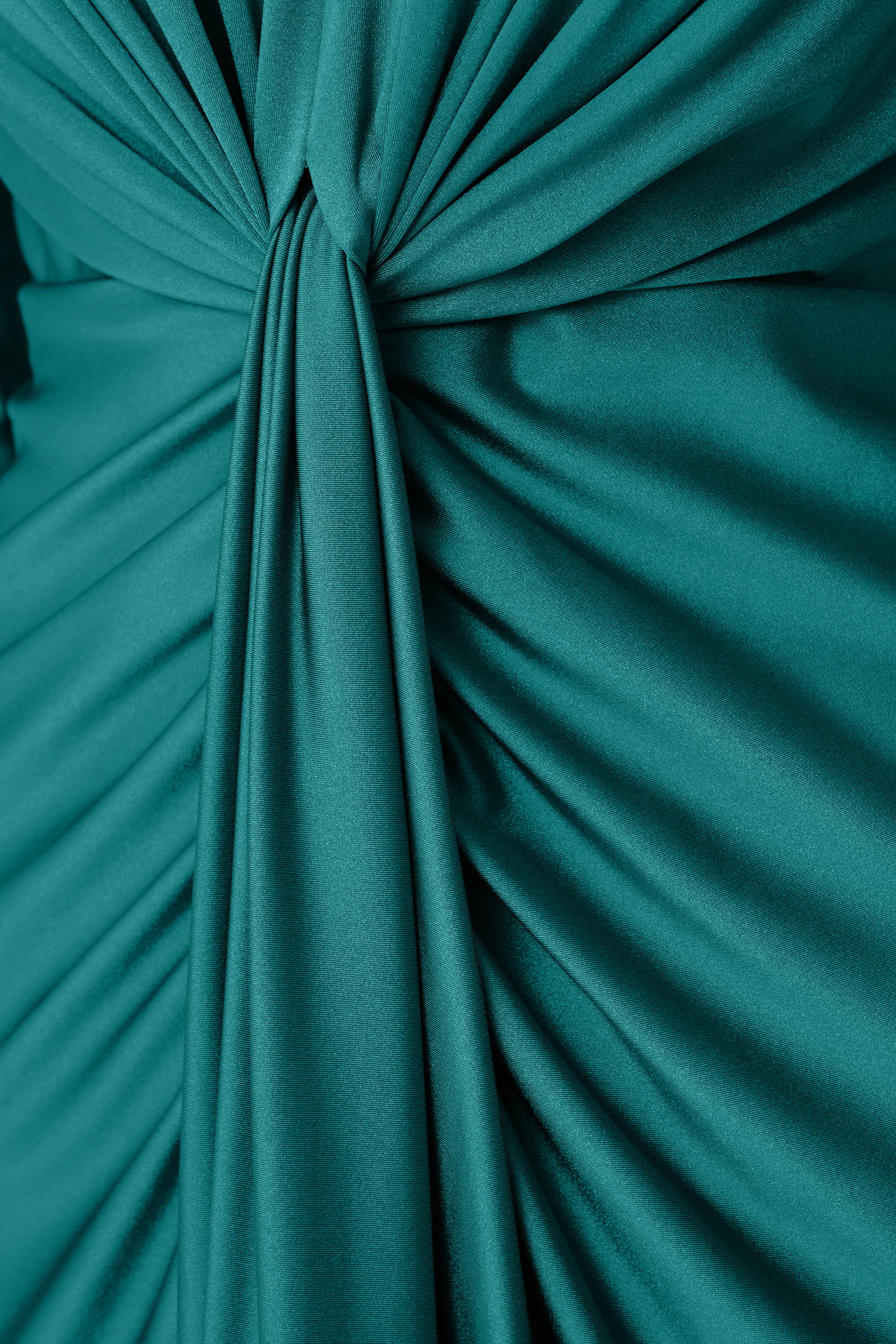Make a striking impression with this dramatic sheath dress, designed to captivate. The draped V-neckline flows seamlessly into a cascading slit detail, exuding elegance with every step. Crafted from a refined knit fabric with a lustrous satin finish, this dress radiates sophistication. Long, straight sleeves offer graceful coverage, while the mid-calf length adds a hint of allure, making it perfect for unforgettable evenings. Part of the Signature Collection.