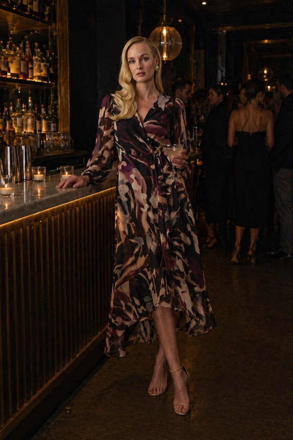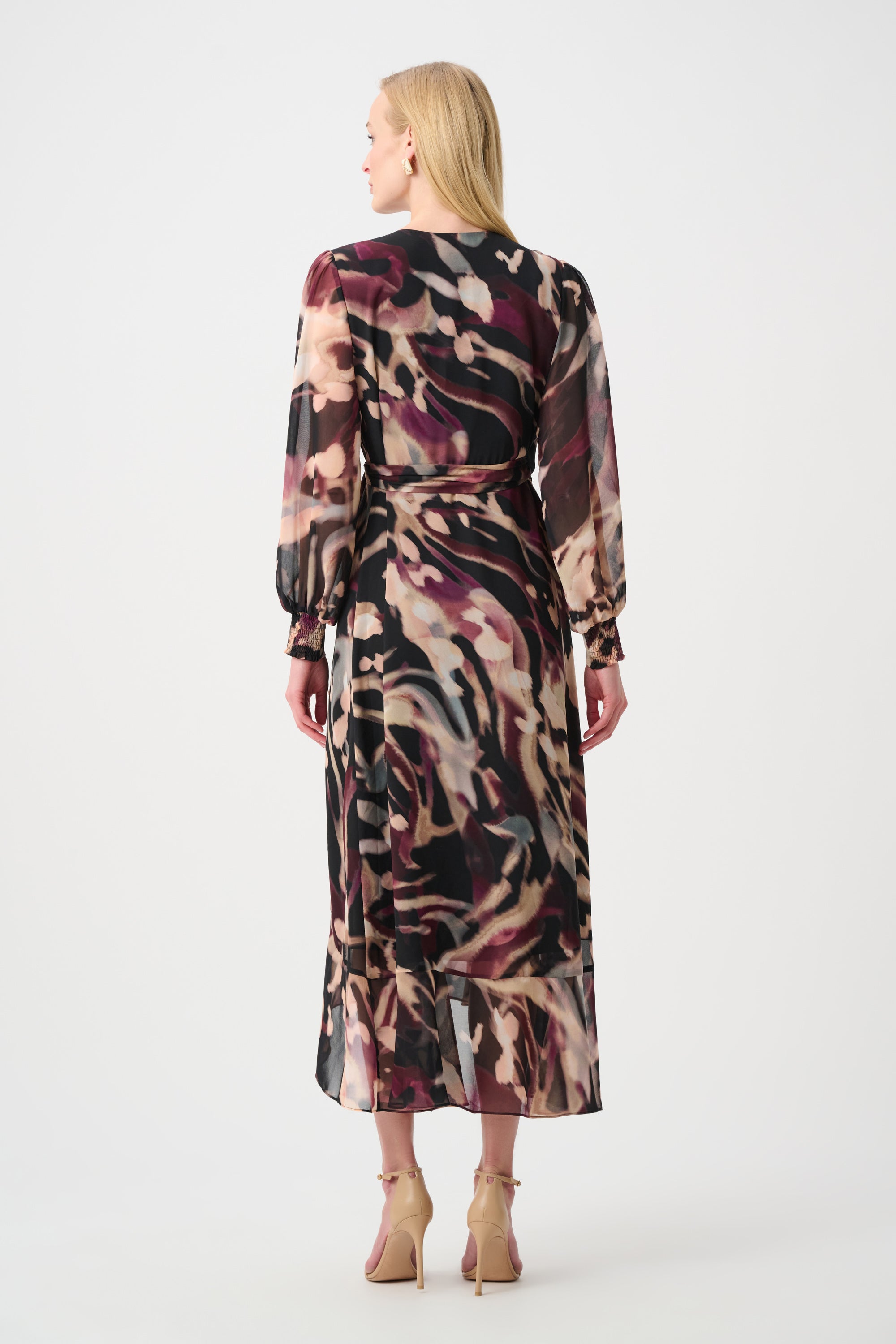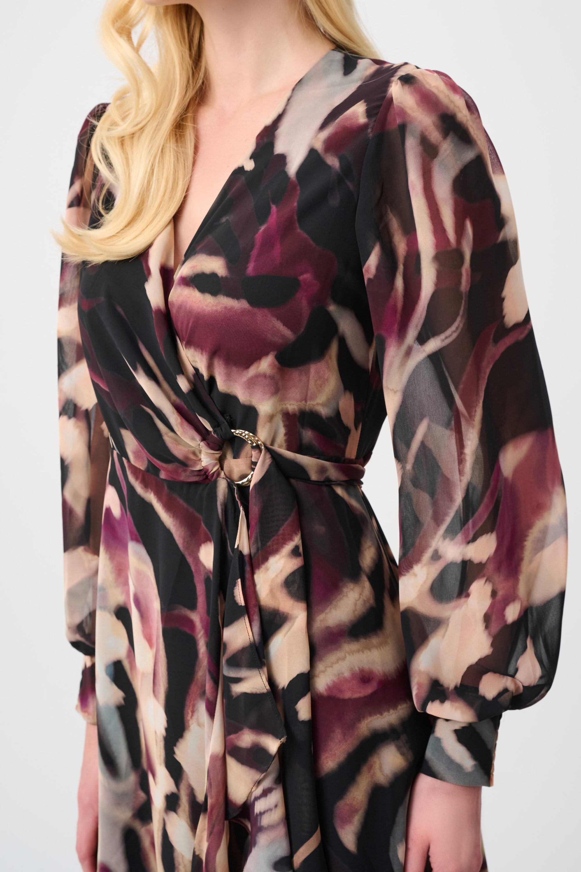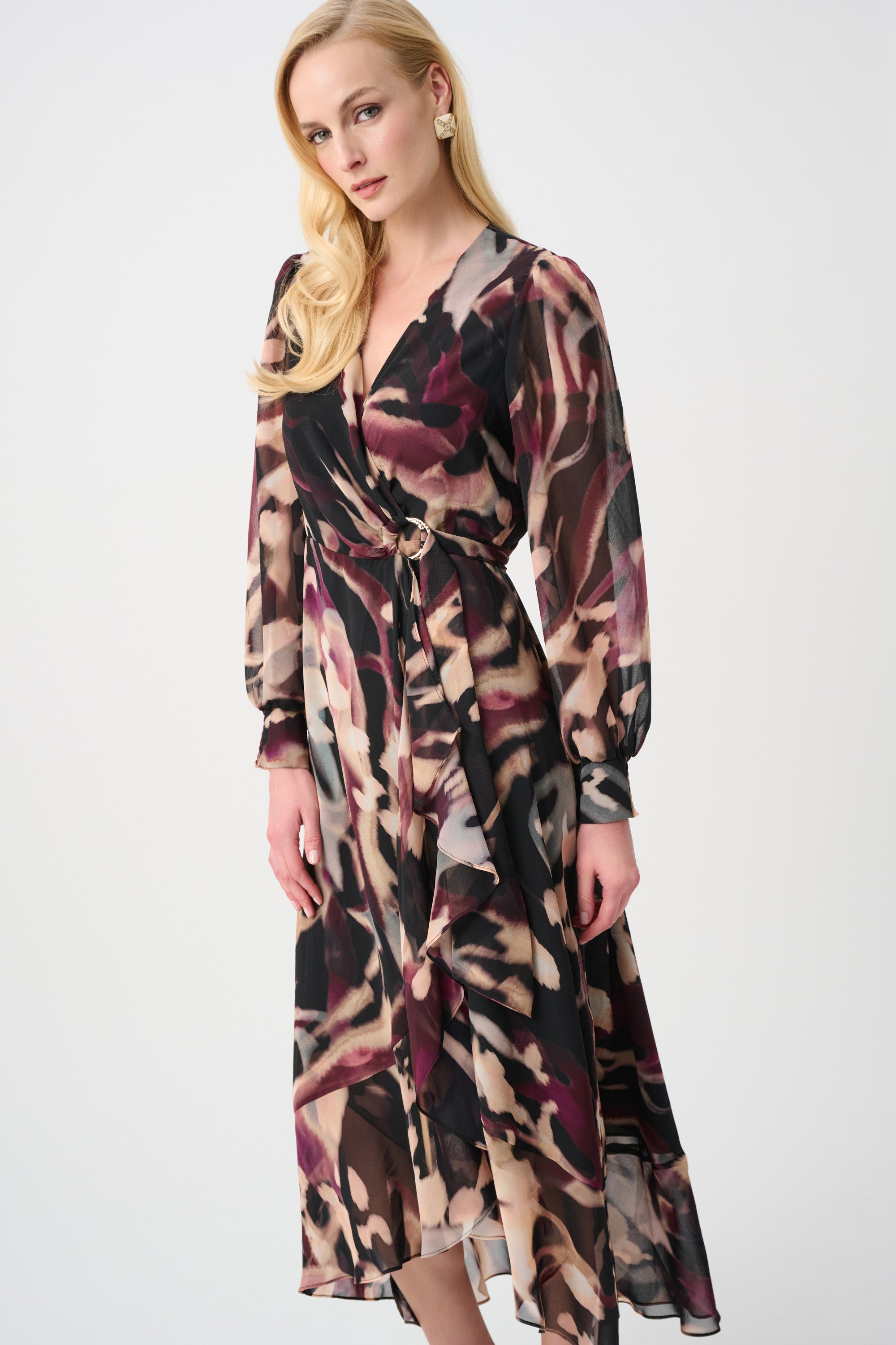 This flowing chiffon wrap dress showcases a dynamic print, letting your personality shine. A genuine wrap with O-ring and sash sculpts the waist, while puffed long sleeves with cuffs and a ruffled bodice hem introduce movement and subtle drama.