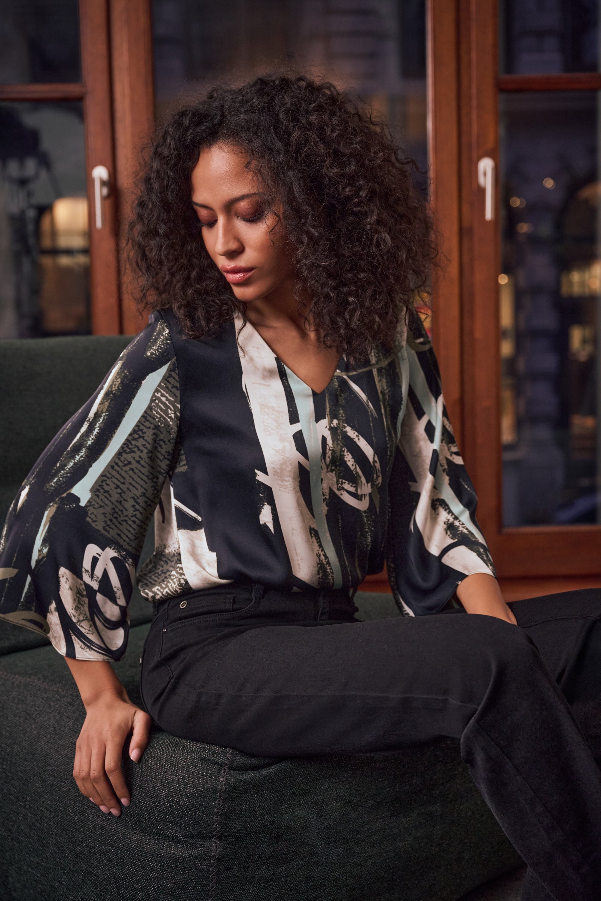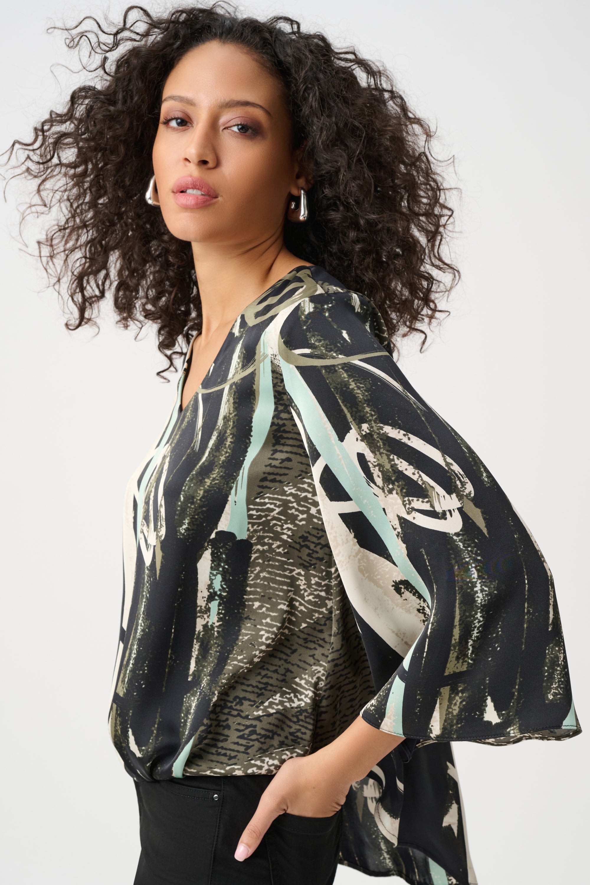 This recycled hammered satin top fuses edgy flair with classic elegance. High-low boxy shaping, three-quarter bell sleeves, and a pleated front hem create movement, while a V-neckline adds refined structure to the bold abstract print.