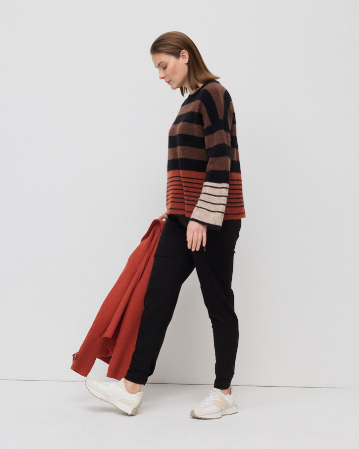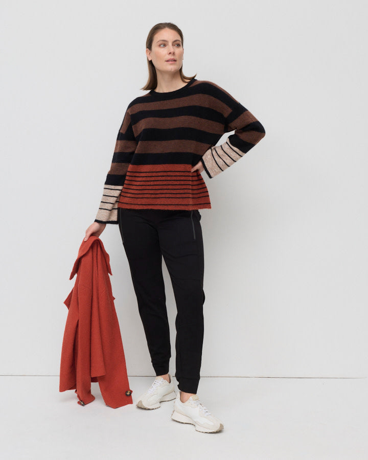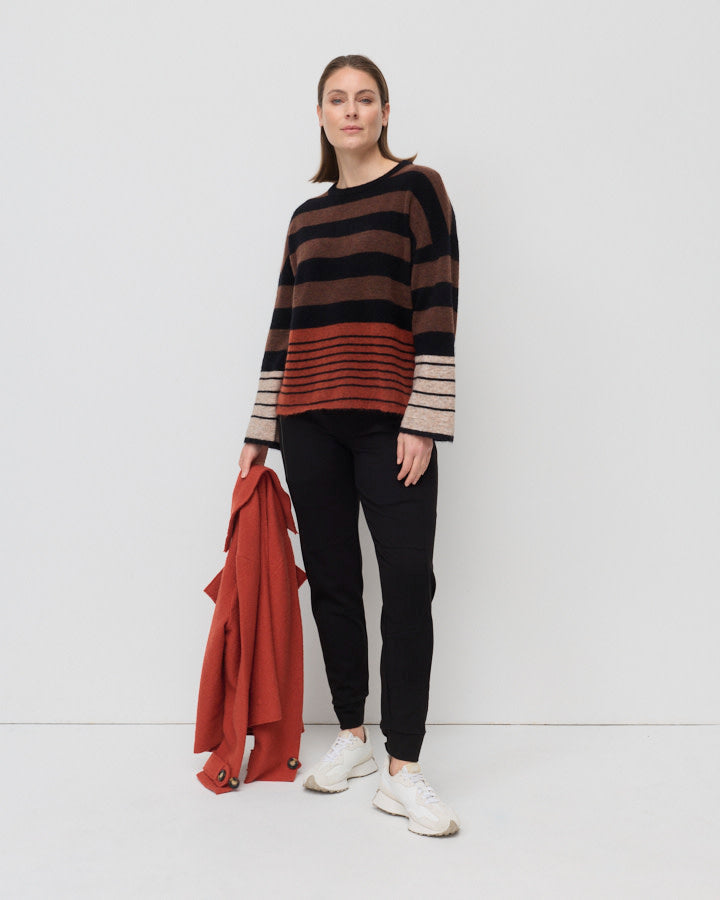 Welcome in the cooler months with our Summit Stripe Sweater, crafted from a cozy mohair blend. The complimentary palette of Black, Chocolate, Rust and Oatmeal colour blocking gives a harmonious look and can easily be paired back with any winter wardrobe. Featuring a round neck and long sleeves, in an effortlessly relaxed fit, enhancing it's versatility and practicality.