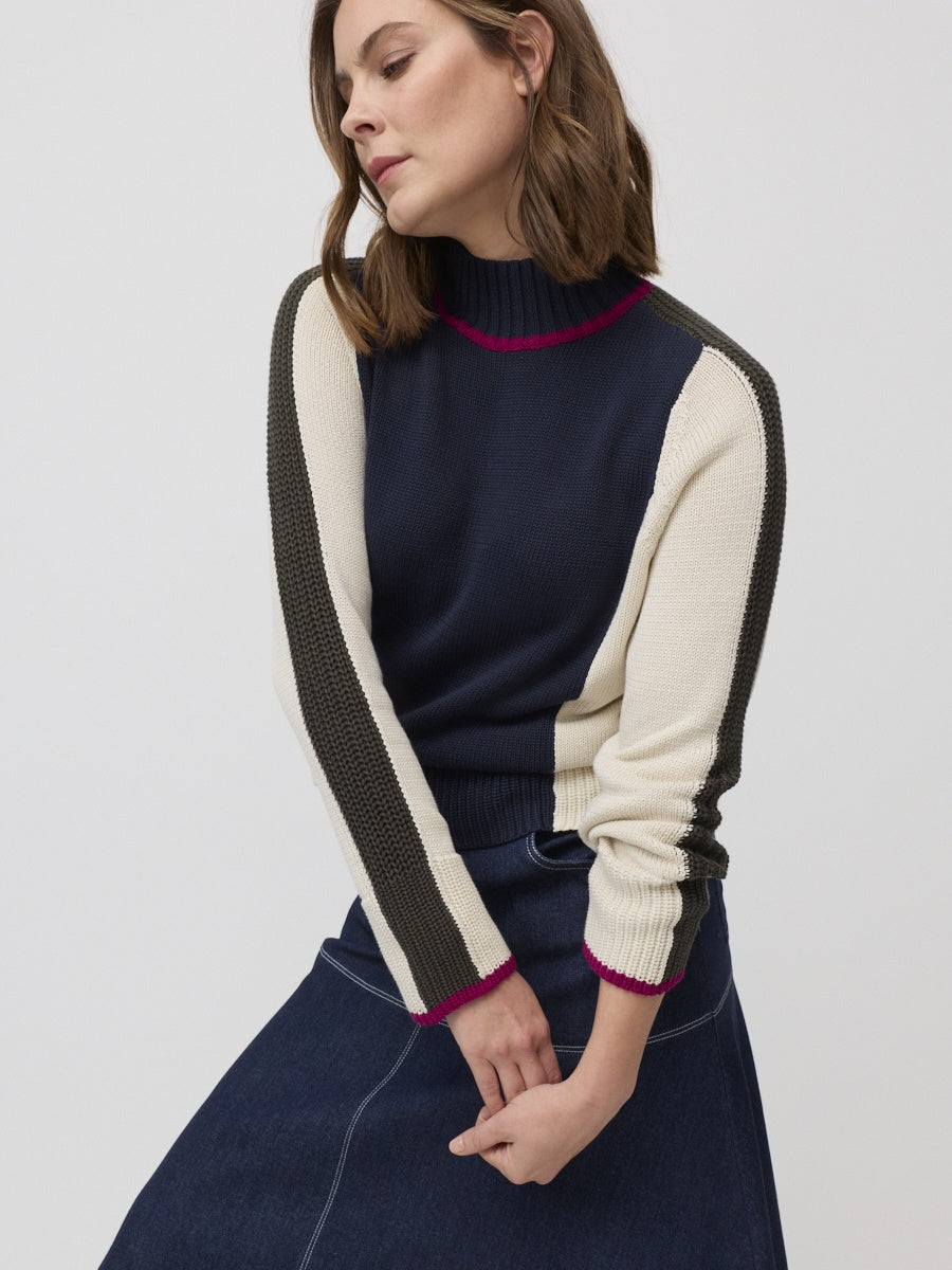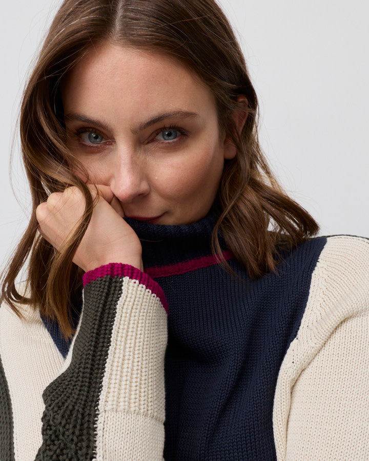 Welcome in the cooler months with our Team Colours Sweater, crafted from 100% Cotton. The complimentary palette of Ivory, Navy, Dark Khaki and Mulberry colour blocking gives a harmonious look and can easily be paired back with any winter wardrobe. Featuring a funnel neck and long sleeves, in an effortlessly relaxed fit, enhancing it's versatility and practicality.