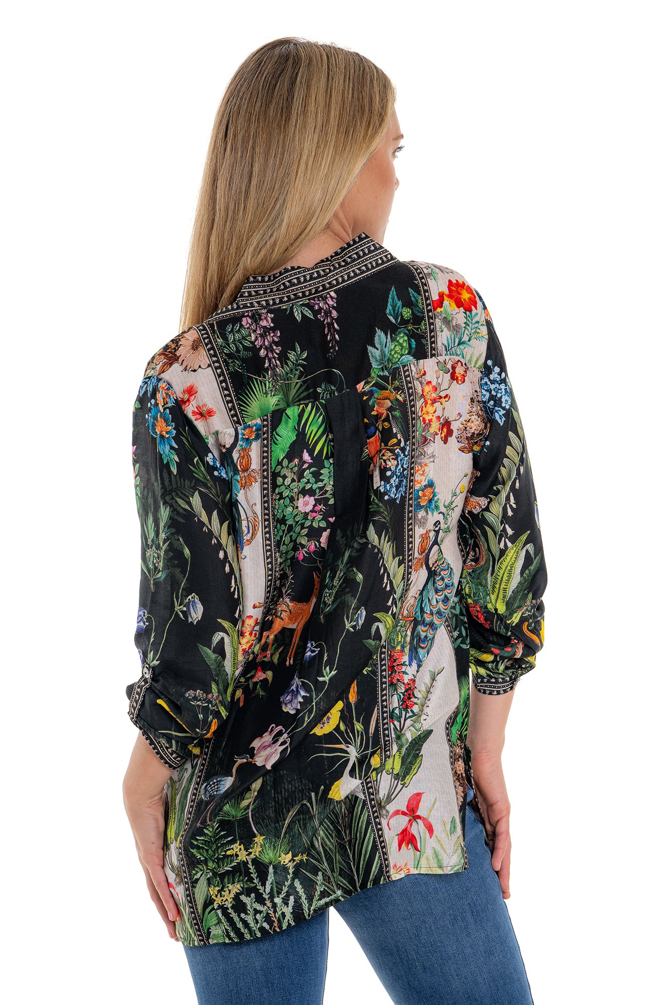 The Forest Shirt in a gorgeous silk blend fabric in shades of amazing bright tones on black.