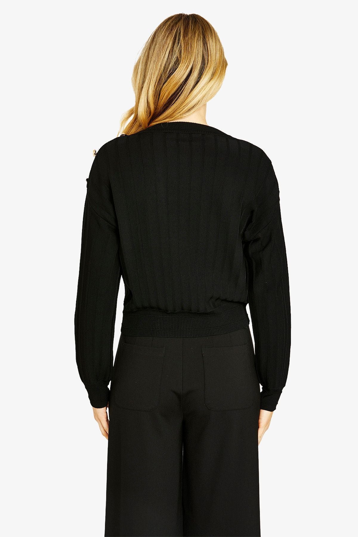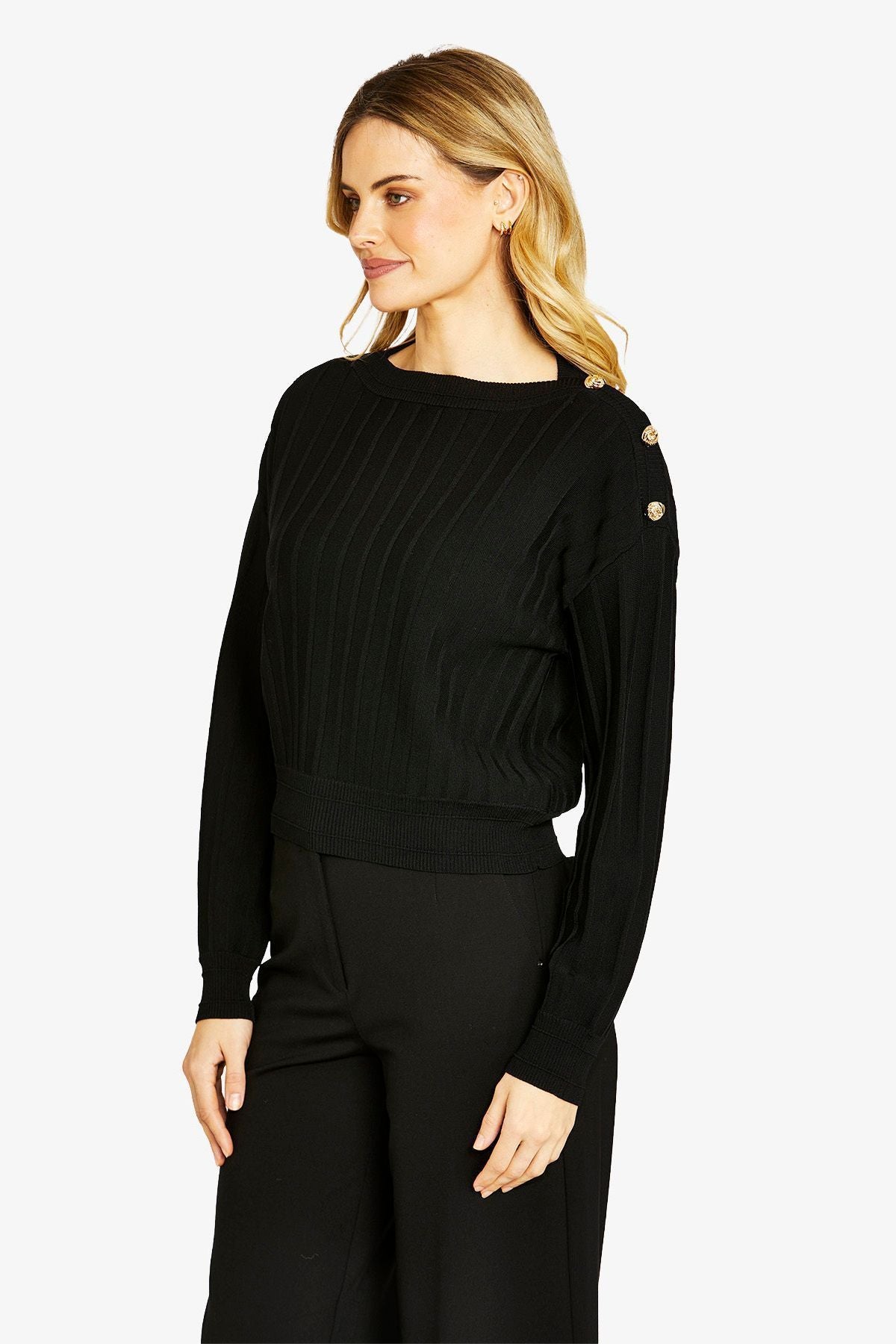 Made from a structured Milano rib knit, the pullover offers a smooth finish with gentle stretch, helping it hold its shape while remaining comfortable to wear. The clean lines and relaxed silhouette make it easy to pair with everything from tailored pants to skirts or denim.