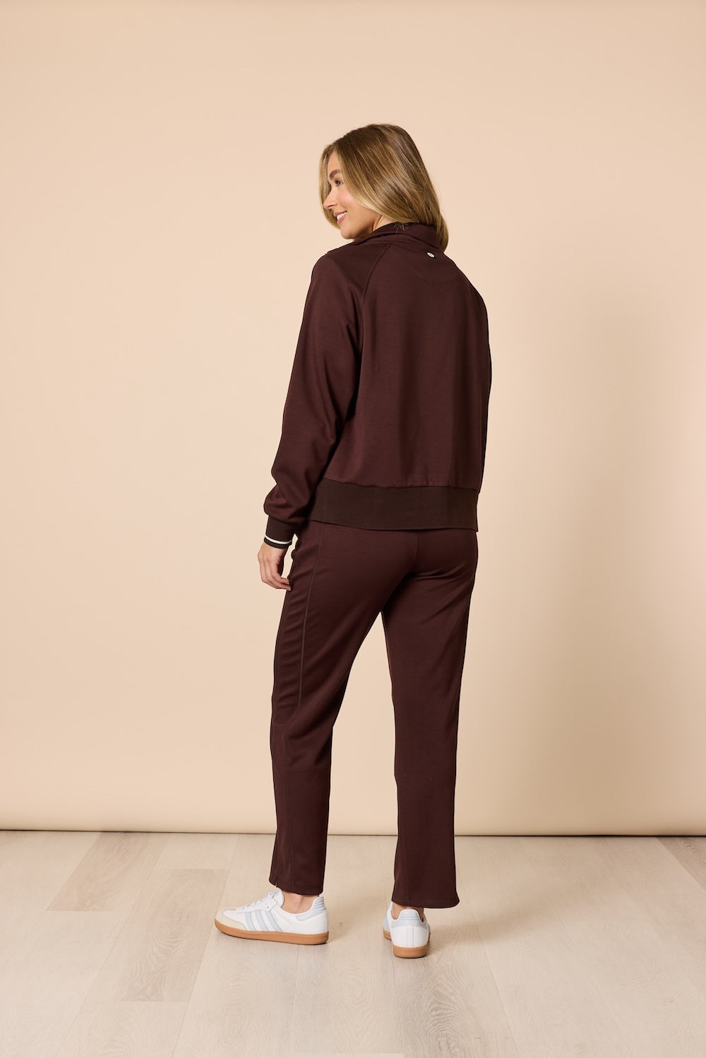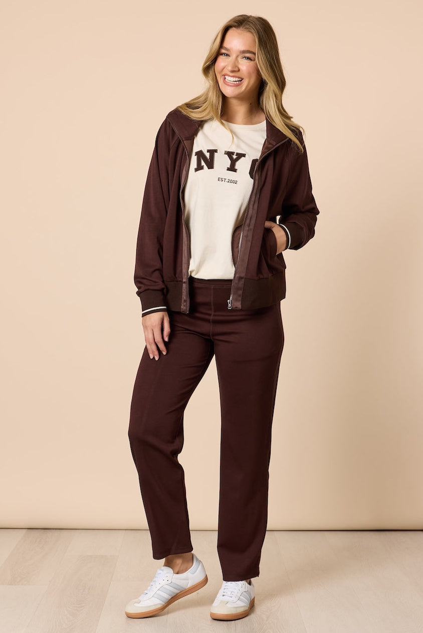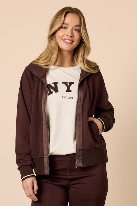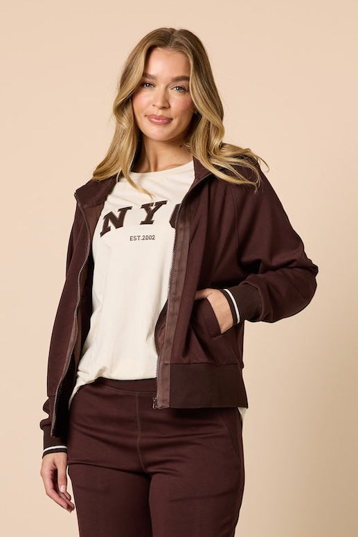 Designed with a smooth, lightweight feel, this full-zip jacket is perfect for both casual days out and comfortable lounging at home. Thoughtful details elevate this essential, ribbed cuffs and hem for a clean finish, a stand collar that adds structure, and tonal trim along the zipper for a refined, modern touch. Side pockets provide convenient storage for small essentials or a cozy place to rest your hands. Wear it with the Urban City Pant for a coordinated look, or layer it over your favourite tee and denim for effortless style wherever your day takes you.