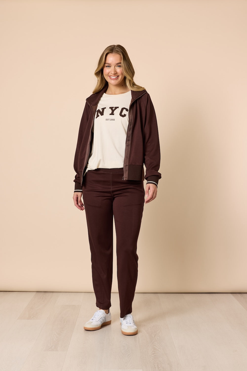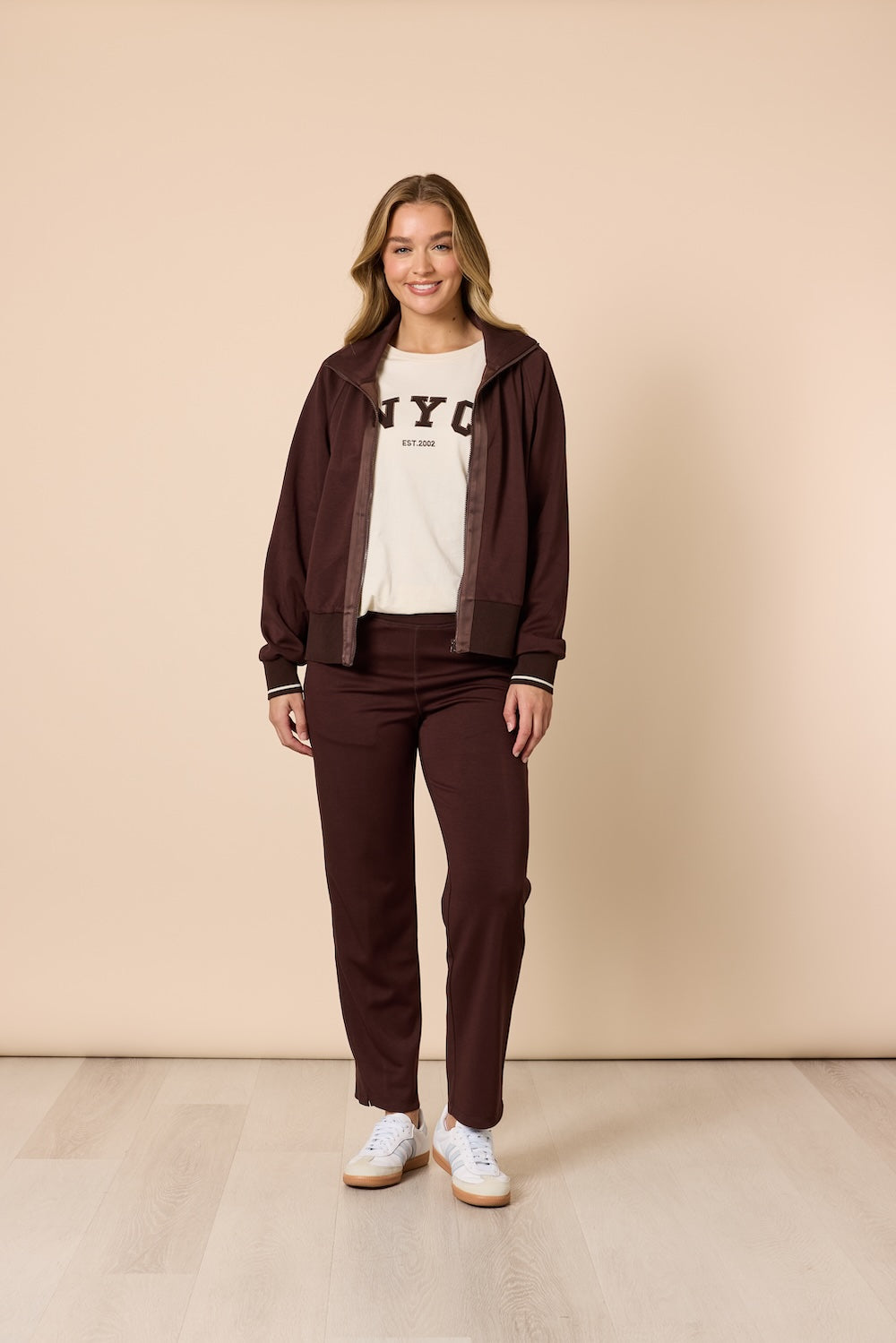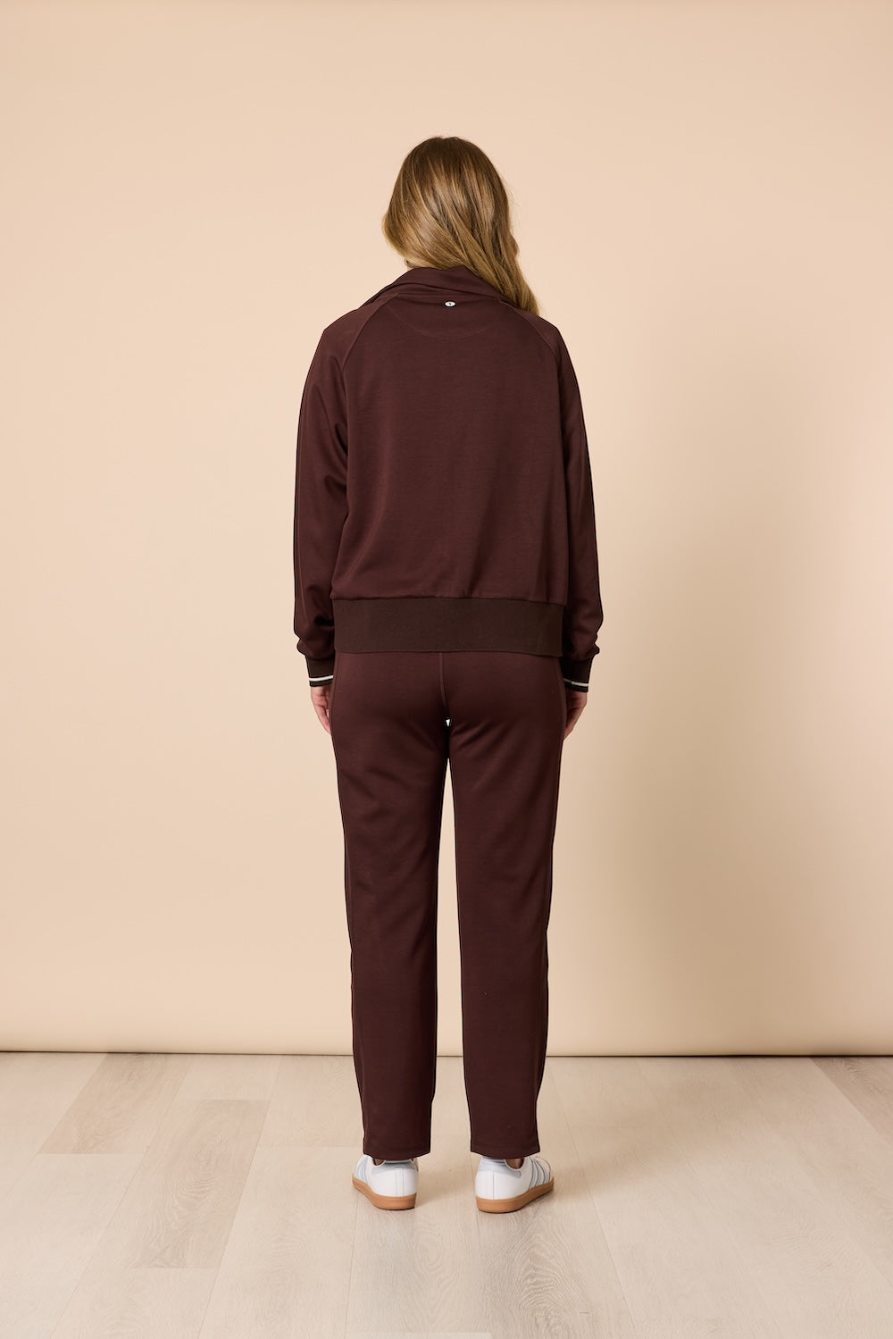 Designed with a smooth, lightweight feel, this full-zip jacket is perfect for both casual days out and comfortable lounging at home. Thoughtful details elevate this essential, ribbed cuffs and hem for a clean finish, a stand collar that adds structure, and tonal trim along the zipper for a refined, modern touch. Side pockets provide convenient storage for small essentials or a cozy place to rest your hands. Wear it with the Urban City Pant for a coordinated look, or layer it over your favourite tee and denim for effortless style wherever your day takes you.