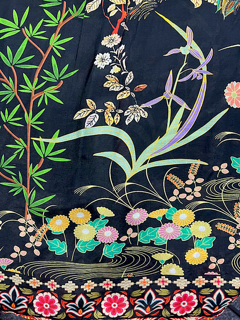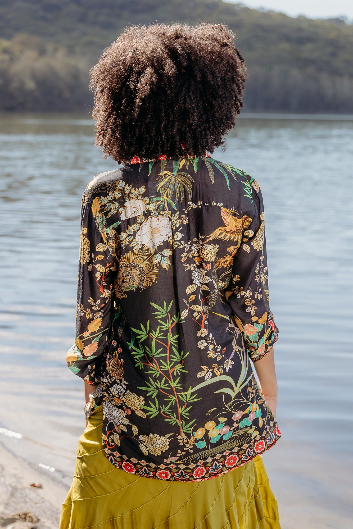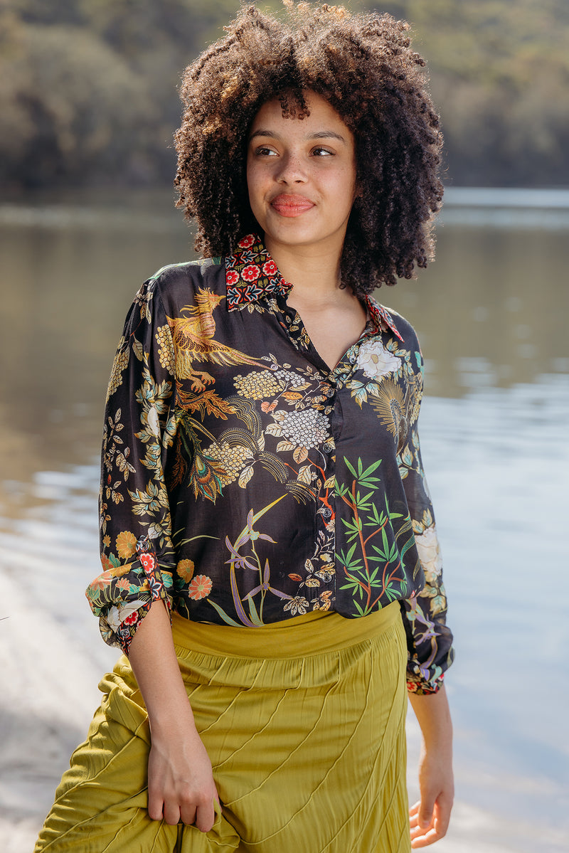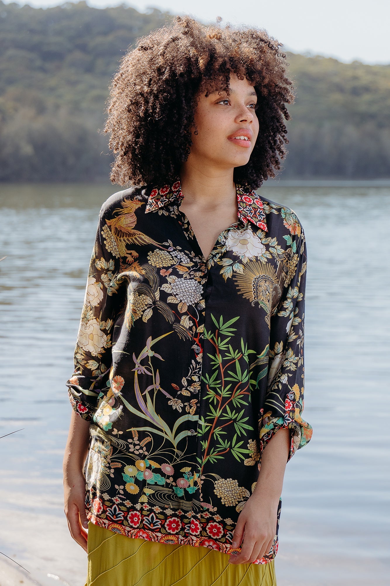 The Phoenix Night Shirt in a gorgeous silk blend fabric in shades of Amazing tones of bright vibrant colours on a black background.
