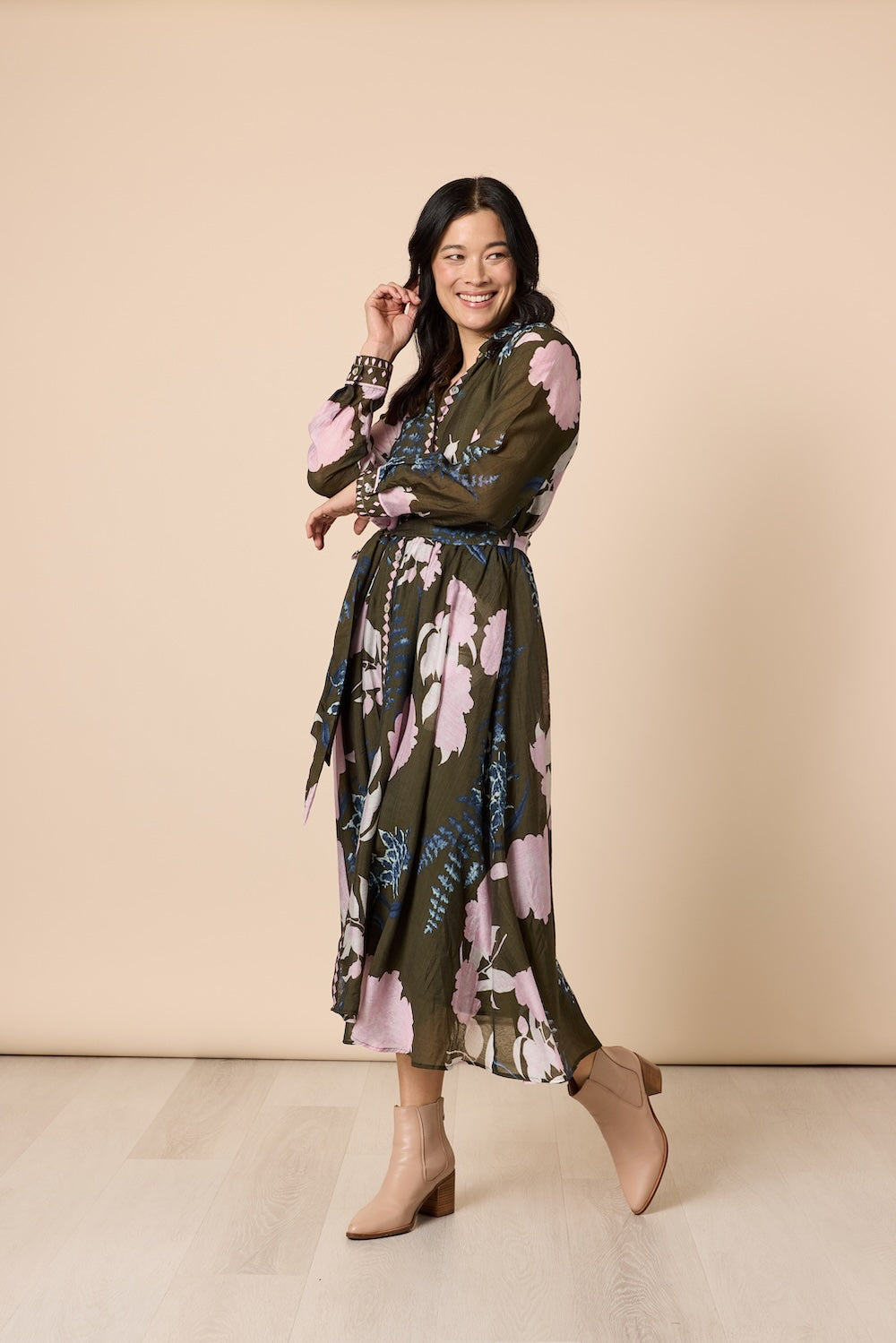 Effortlessly elegant with an earthy, romantic touch, the Colorado Print Dress is a statement midi crafted for timeless everyday style. Designed with a flattering tie-waist silhouette, button-down neck line, and flowing skirt, it gently defines the shape while offering graceful movement. The long sleeves make it perfect for transitioning through seasons, from breezy autumn days to polished evening outings.