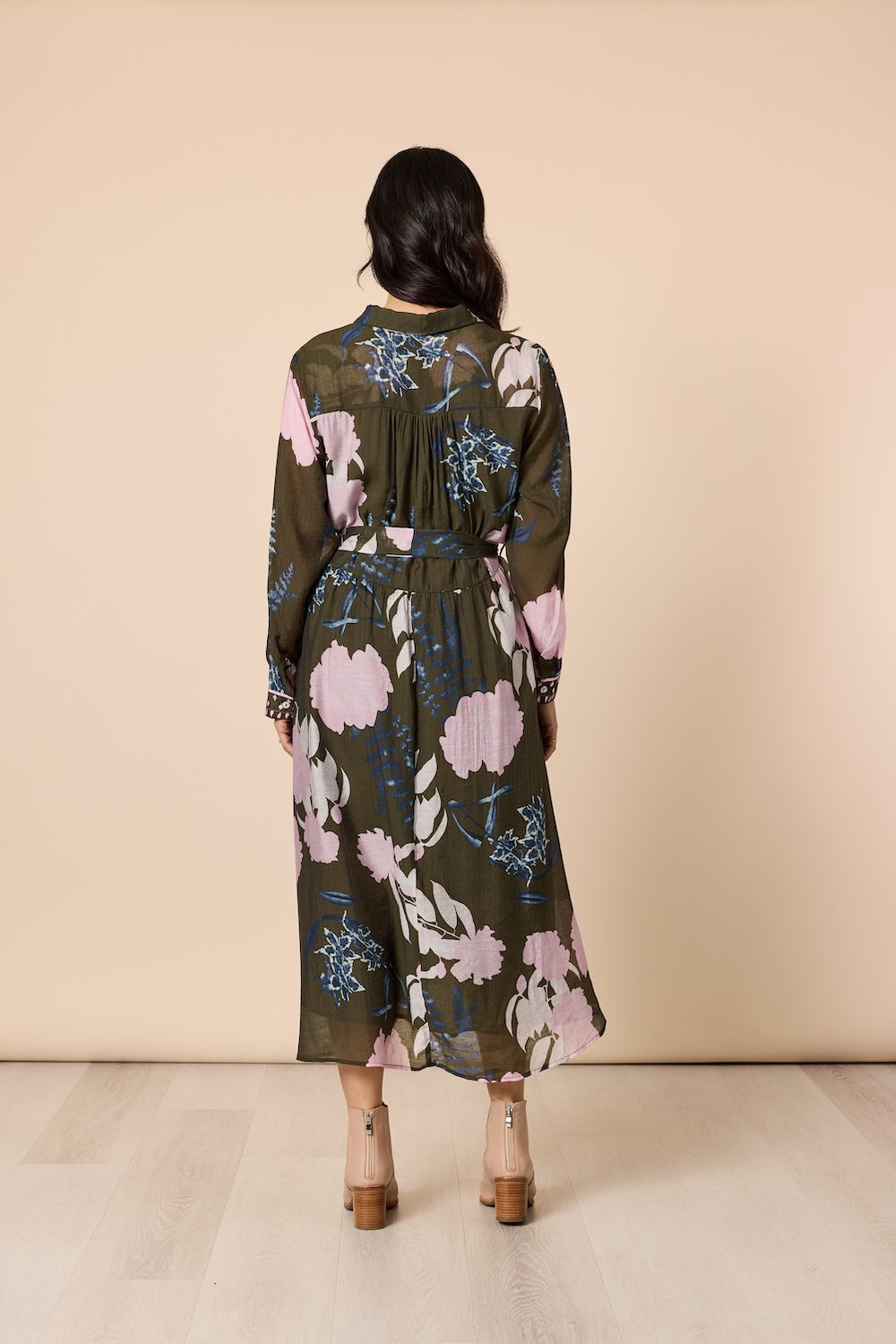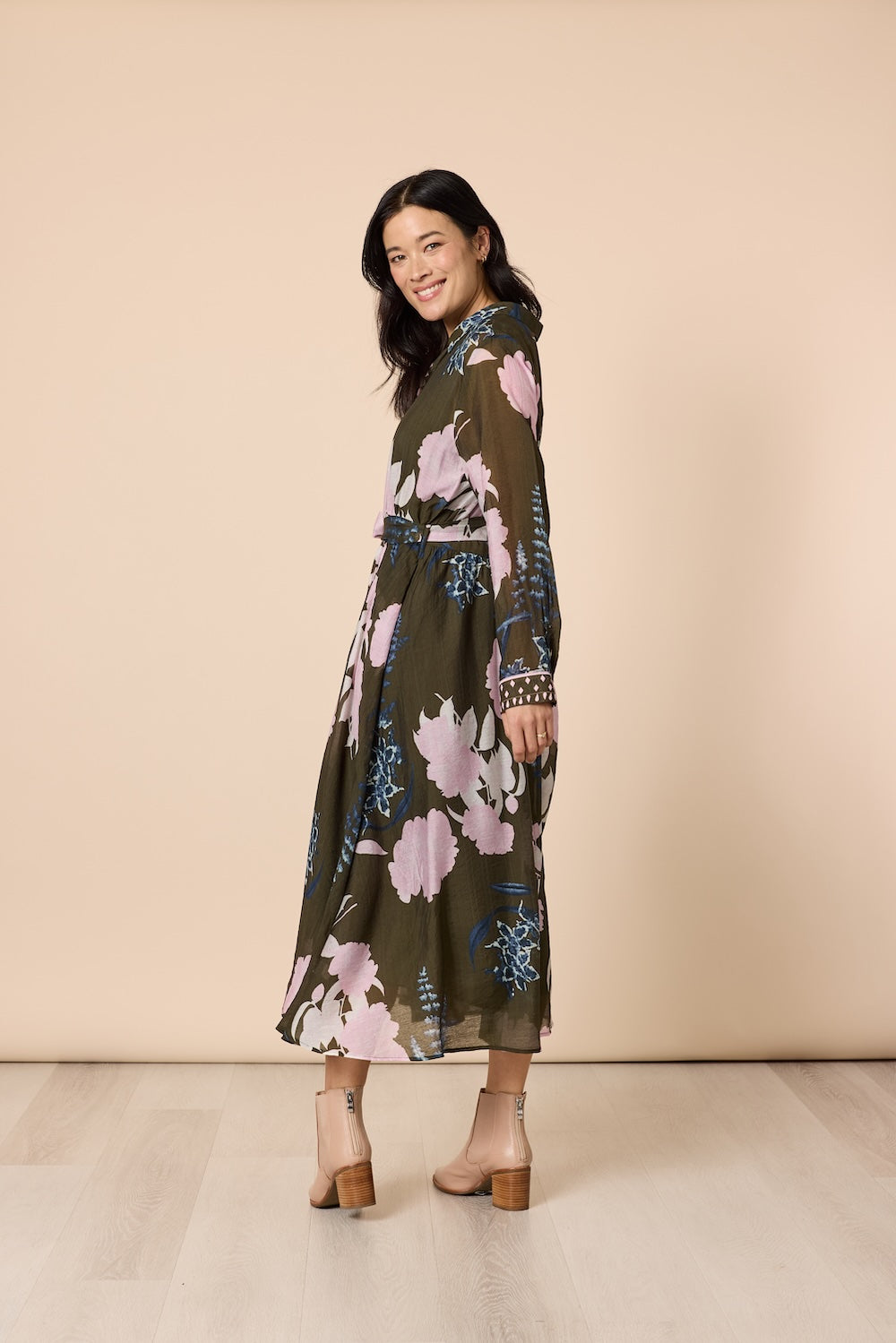 Featuring a rich khaki/olive base adorned with a delicate vintage-inspired floral print in dreamy blush, blue, and cream tones, this dress brings together natural warmth and feminine charm.