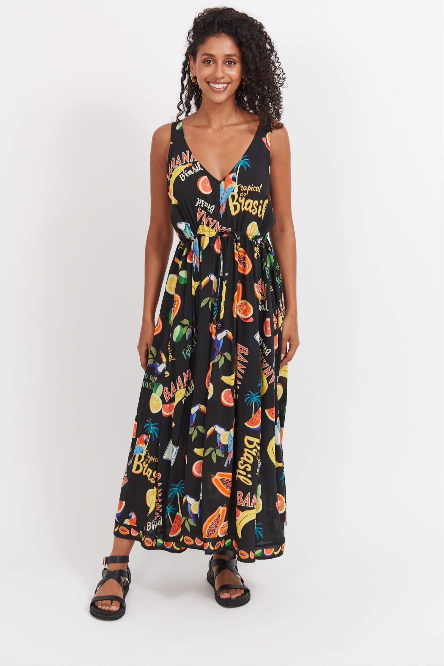 This easy-fitting maxi dress features adjustable shoulder straps, a relaxed V neckline, and an encased self-fabric drawstring to define the waist. The lightweight drape is finished with internal pockets and a bold contrast border panel at the hem for a standout look.