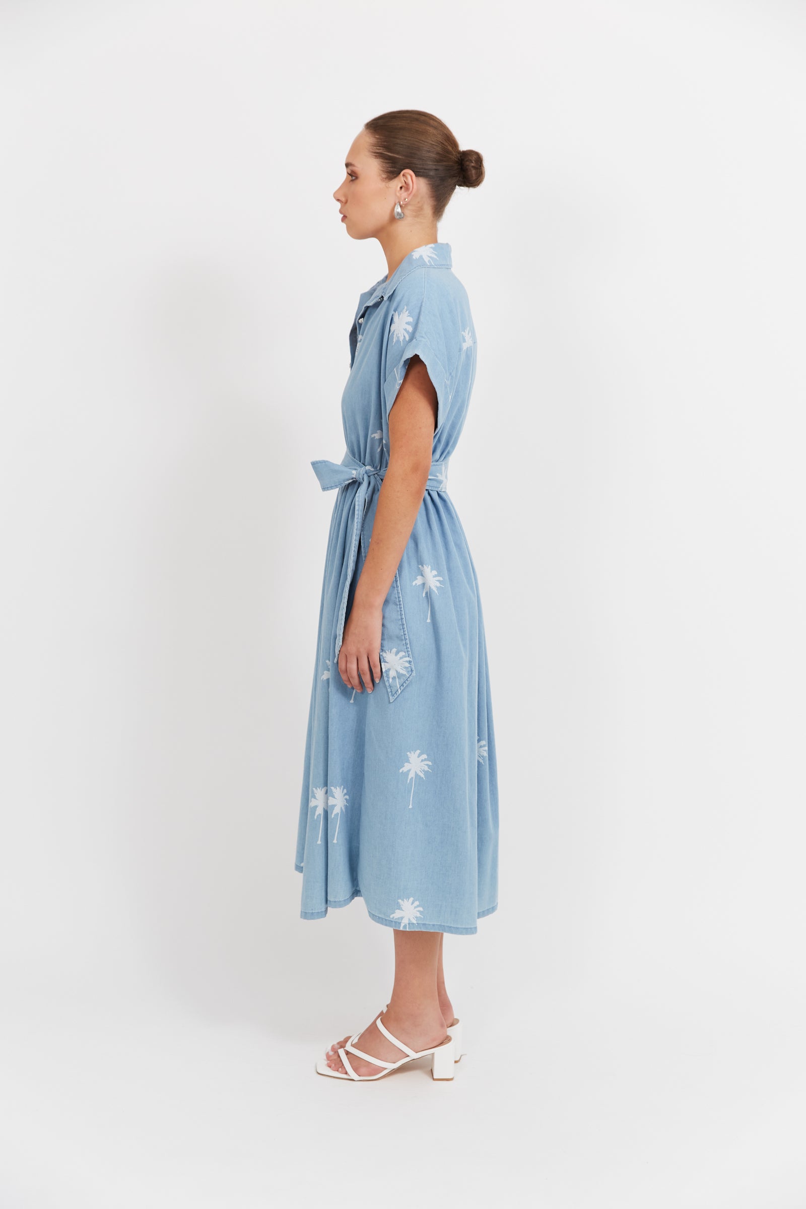 Casual with a splash of personality, the Montego Denim Shirt Dress brings a playful twist to classic denim. Featuring a palm tree motif print, custom shell-shaped front buttons, an elasticated waist, self-tie belt and internal side pockets.