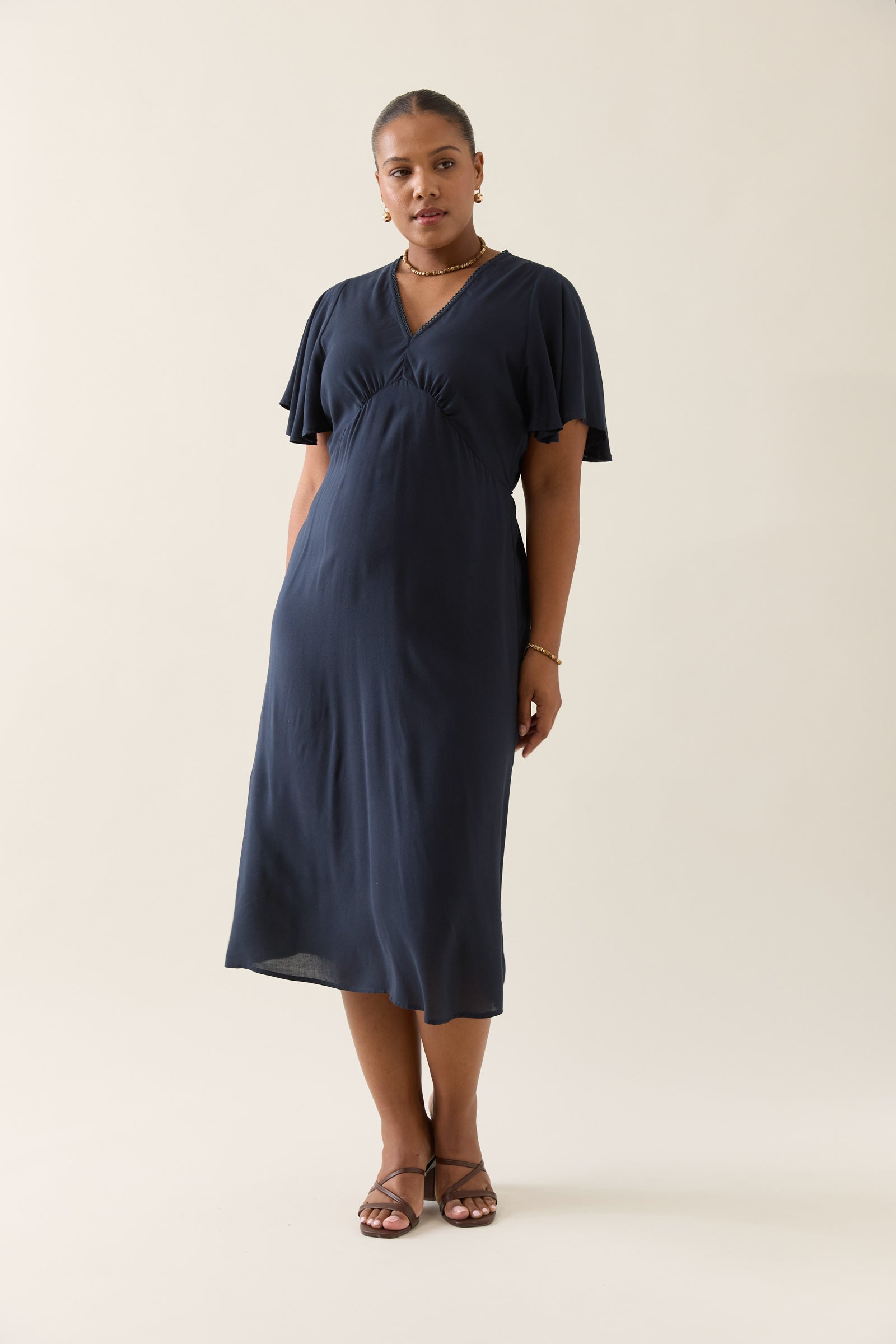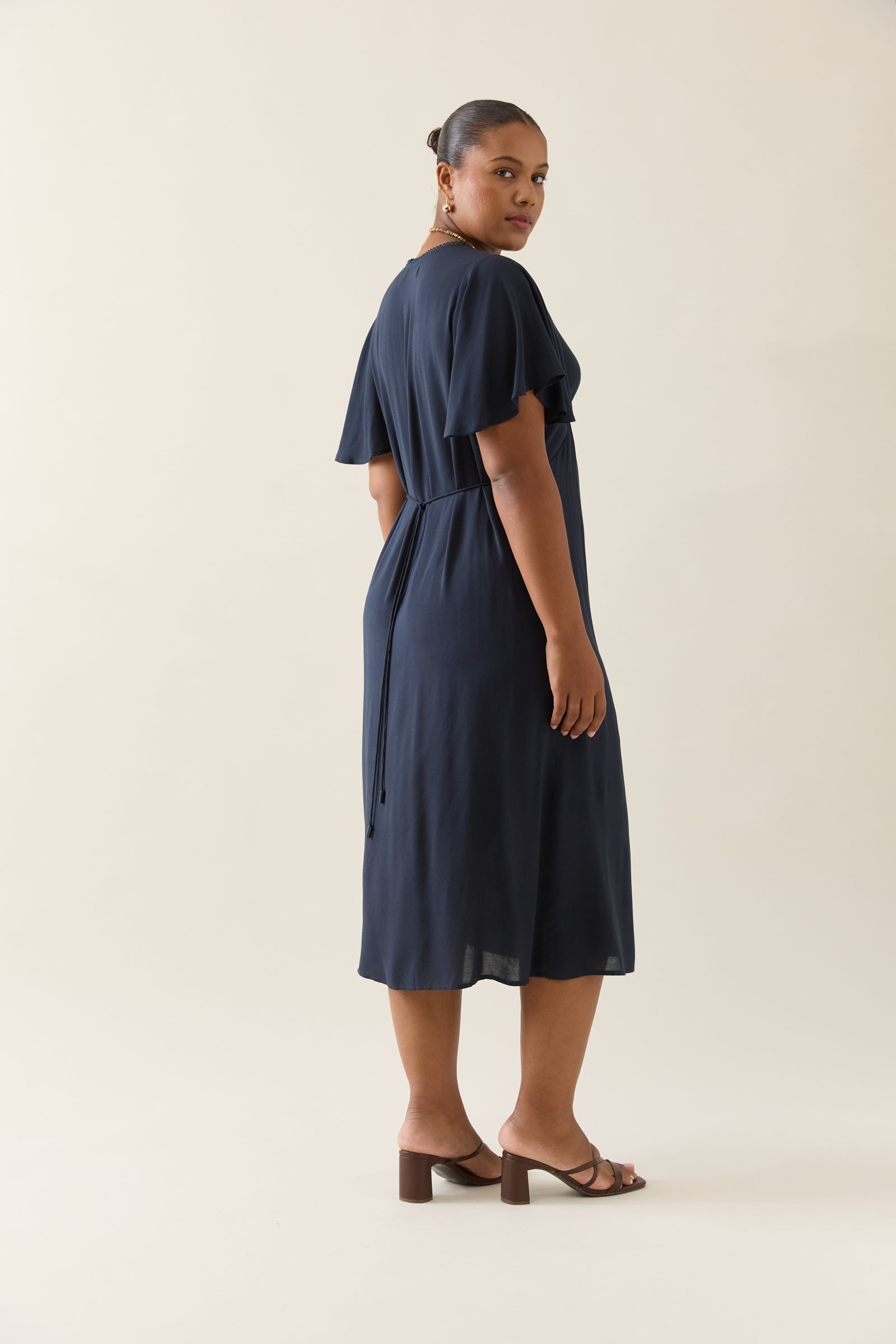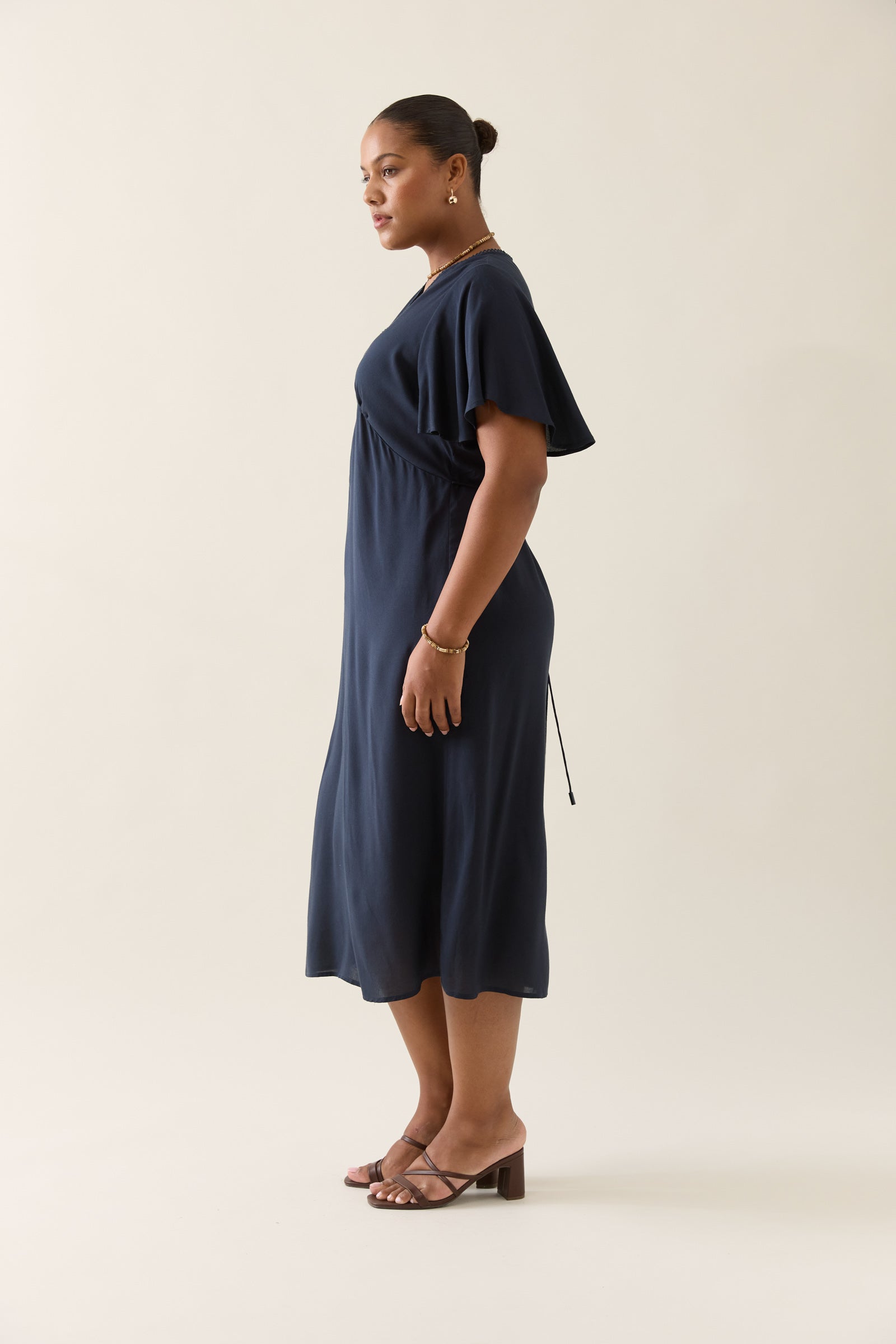 Feminine, functional and flowing, the Oline Midi Dress is crafted to flatter with a gathered bust, adjustable waist ties and soft flutter sleeves. An effortless choice for weekend plans.