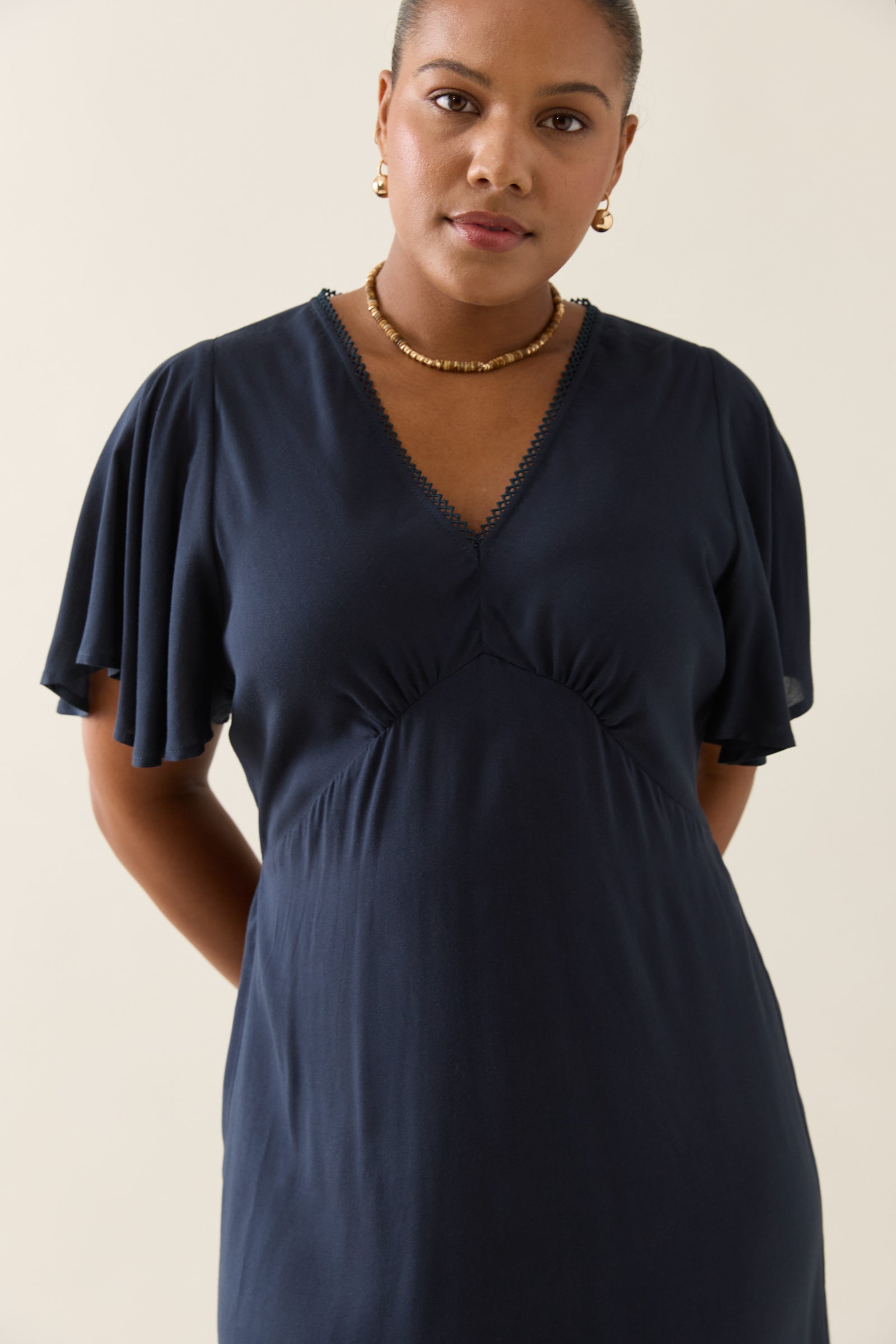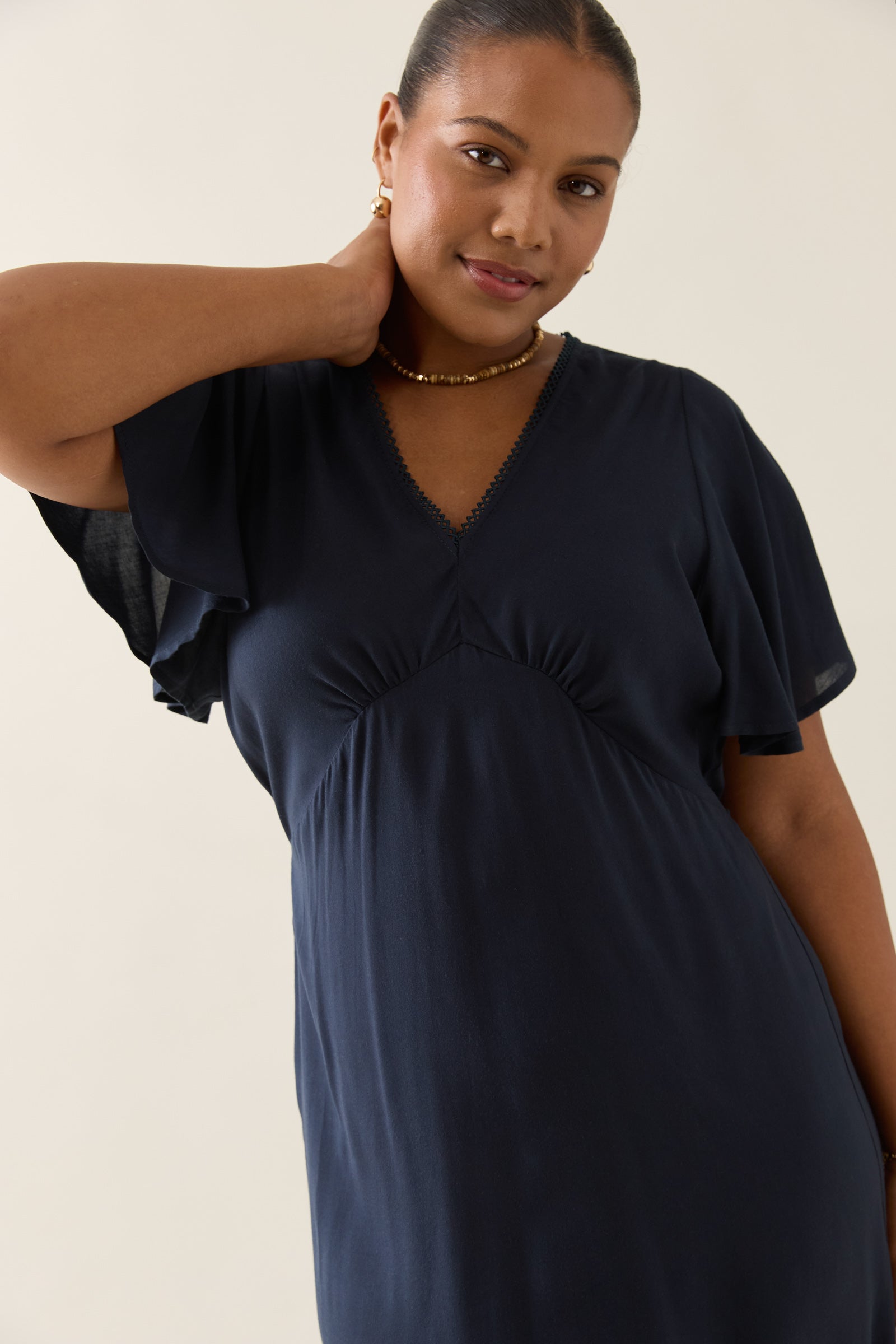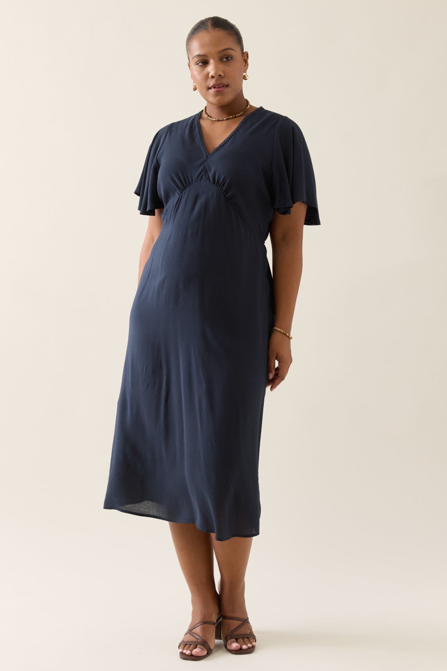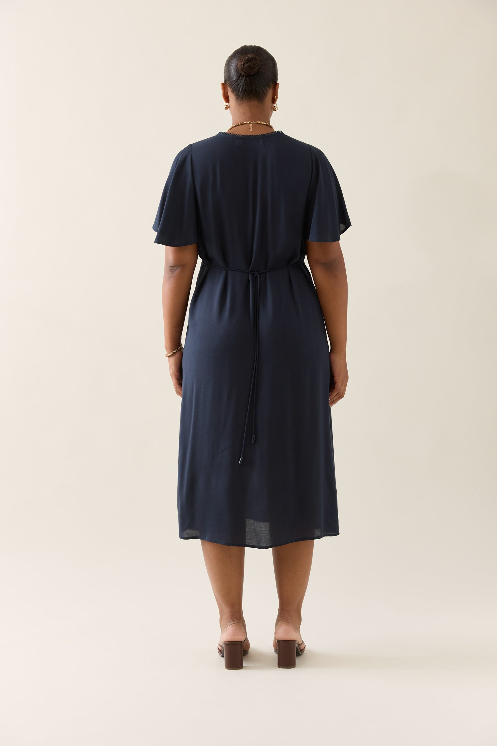Feminine, functional and flowing, the Oline Midi Dress is crafted to flatter with a gathered bust, adjustable waist ties and soft flutter sleeves. An effortless choice for weekend plans.
