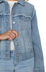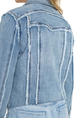 Expertly crafted from a light wash denim, this trucker jacket seamlessly blends timeless ruggedness with a modern touch. With raw and unfinished edges, it captures a distinct vintage aesthetic while maintaining a contemporary appeal.