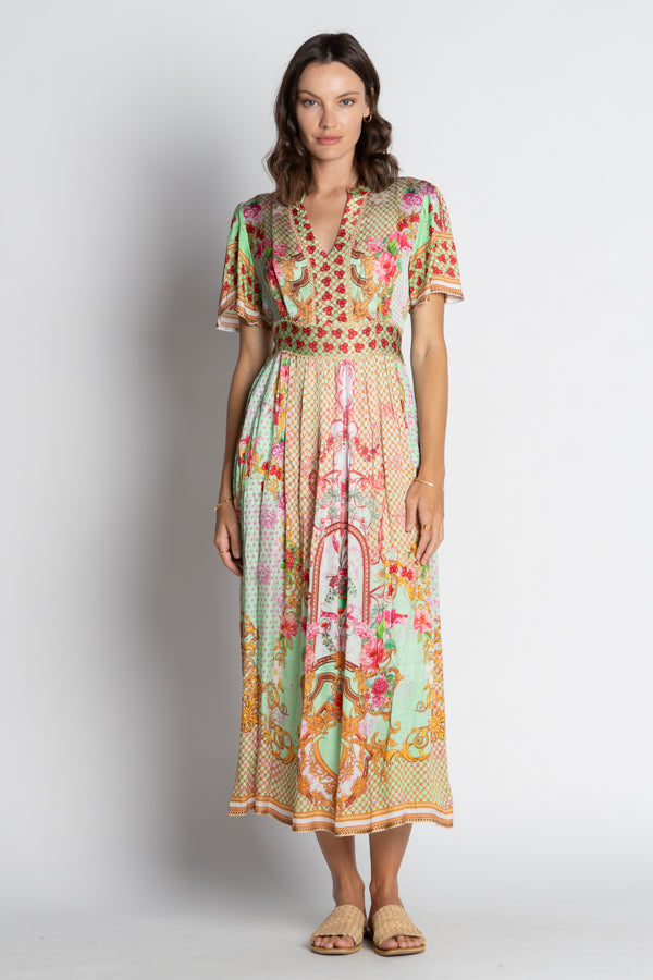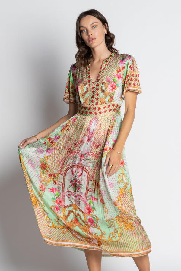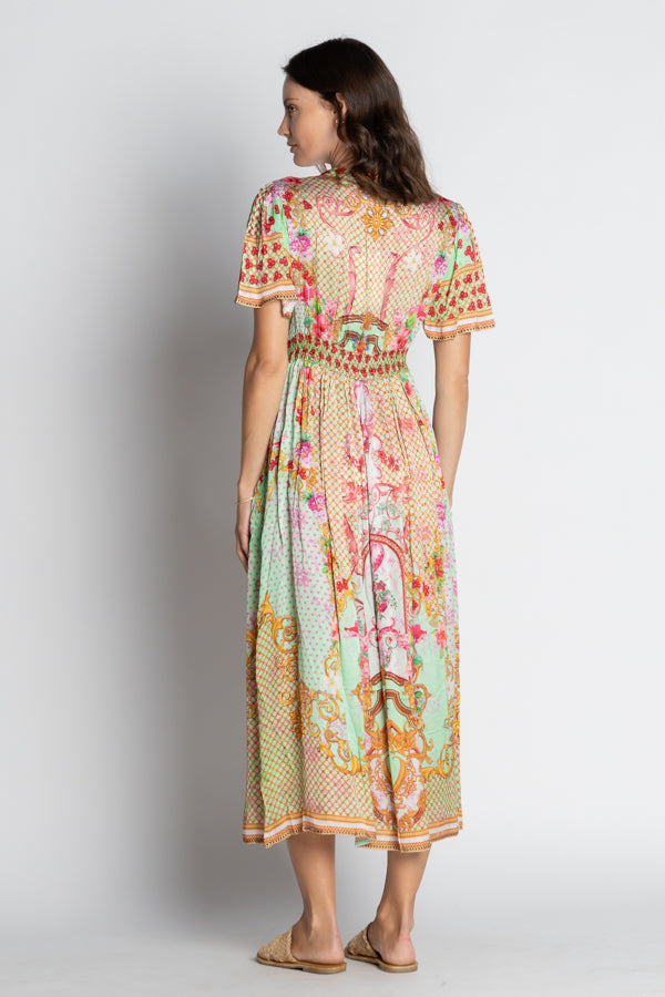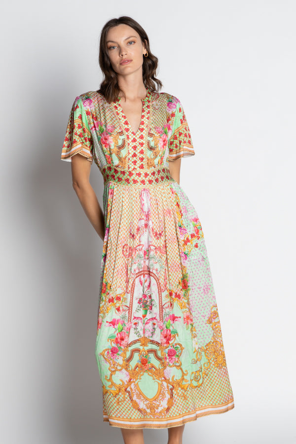 The gathered A-line skirt flows beautifully below the calf, while above-elbow sleeves add a touch of elegance. Practical side pockets meet stylish details like mat gold micro-piping and a stunning digital scarf placement print. Crafted from 100% viscose modal, it offers a lightweight, breathable feel ideal for warm days or layered looks. Perfect for relaxed outings, travel, or dressier moments, the Pellicano Midi Dress Mint combines comfort, style, and practicality in one timeless design.