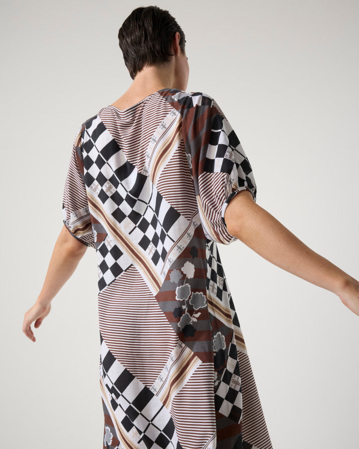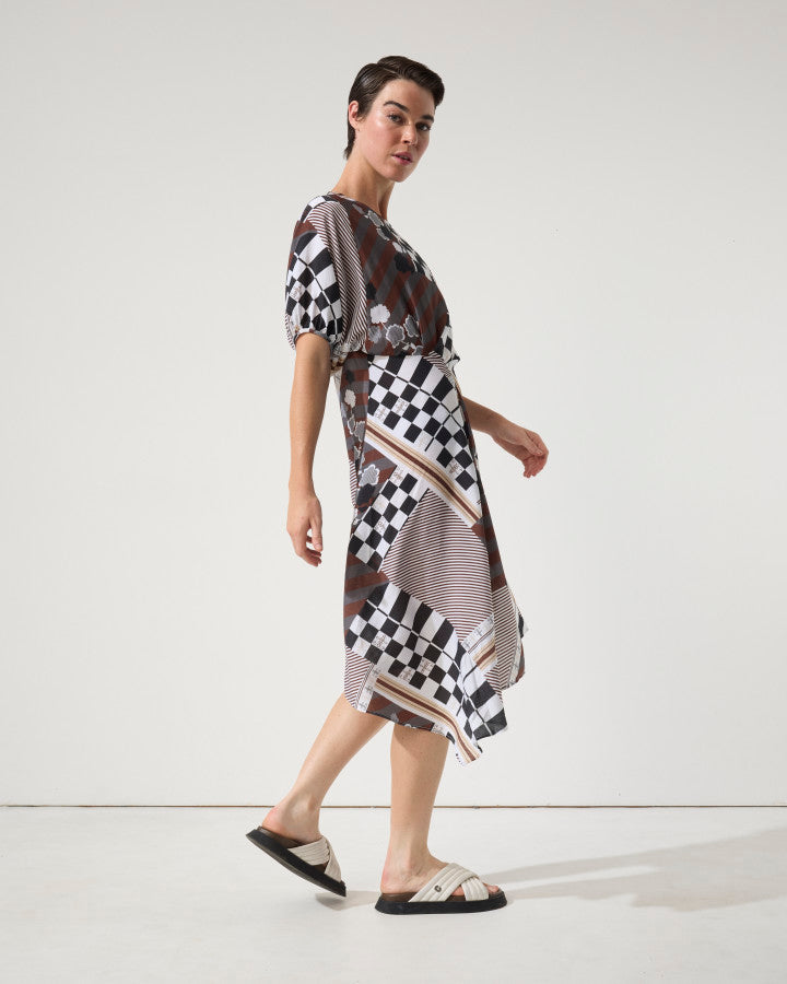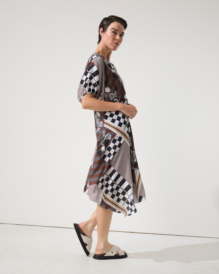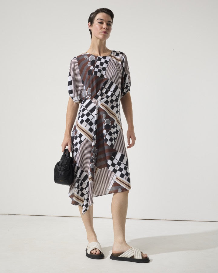 Striking yet effortless, the Draped Collage Dress from Marco Polo showcases an exclusive burgundy-brown print in a soft, fluid silhouette. Designed with front tucks that gently shape the waist, it creates a flattering, naturally cinched effect without sacrificing comfort. Circular short sleeves drape loosely for a relaxed, oversized feel, while the asymmetric hem adds quiet movement. Finished with a round neckline, functional inseam pockets, and a below-the-knee length, this is an easy pull-on style that balances statement and simplicity – perfect for workdays, dinners, and everything in between.