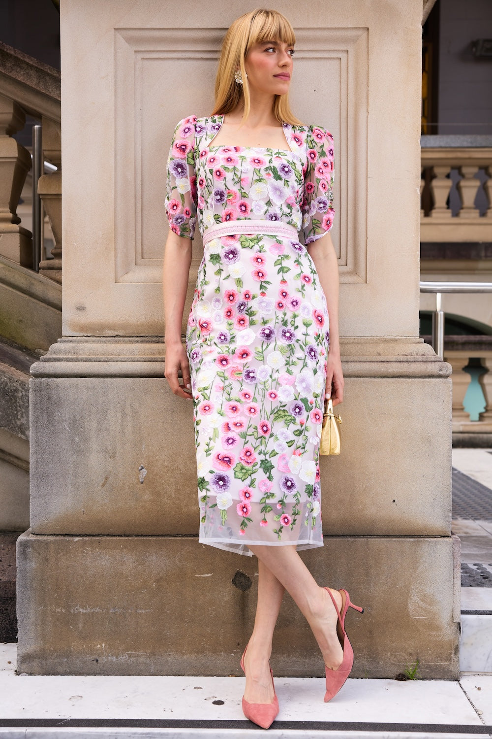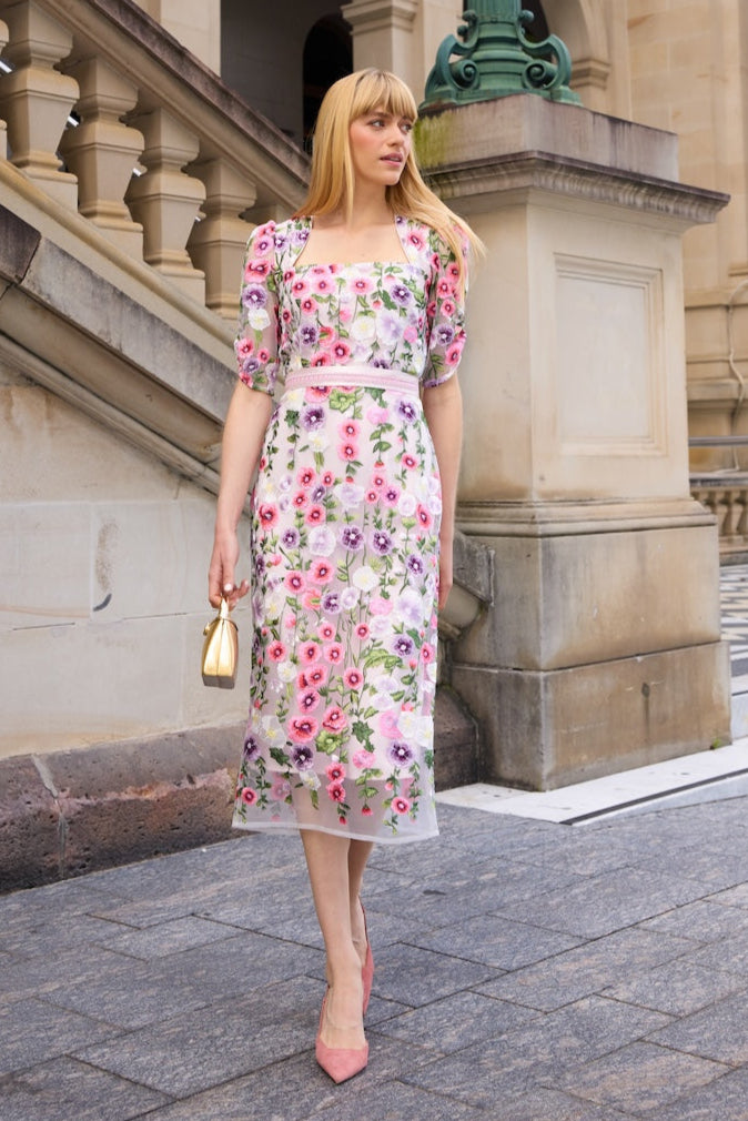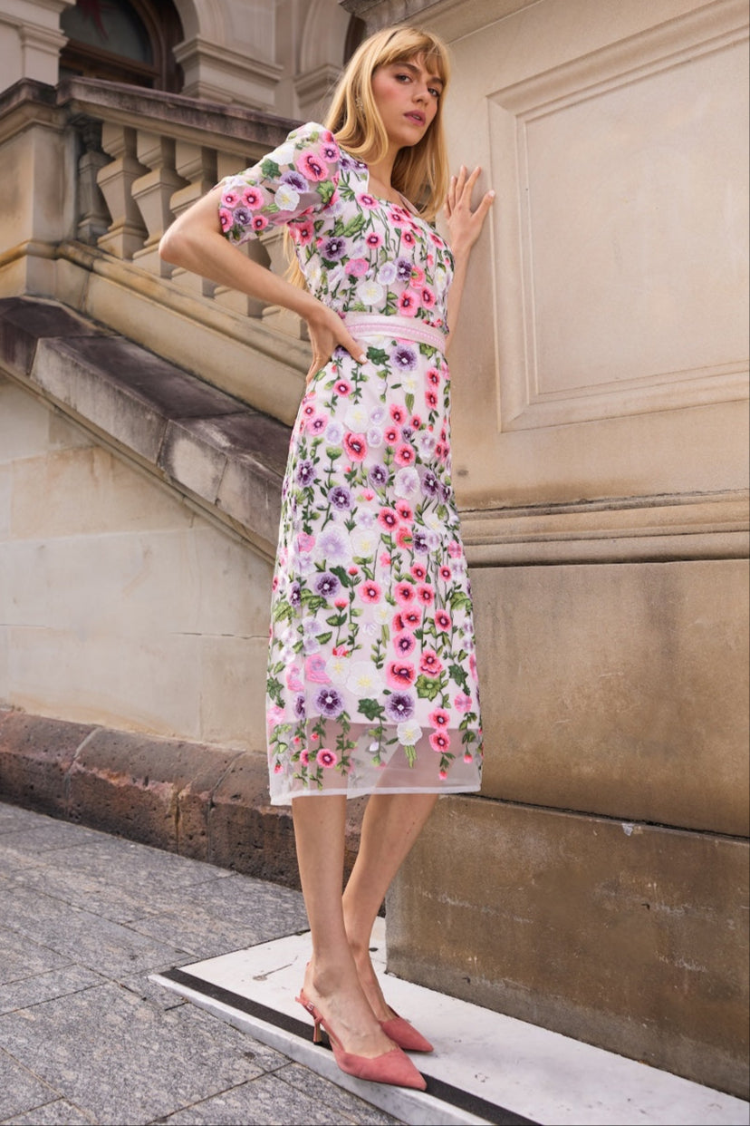 The Alyssium Midi Dress is made from an embroidered floral lace mesh with scalloped neckline that beautifully shapes the décolletage. Finished with a braided tie belt and soft puff sleeves, this midi length style is perfect for special occasions and events.