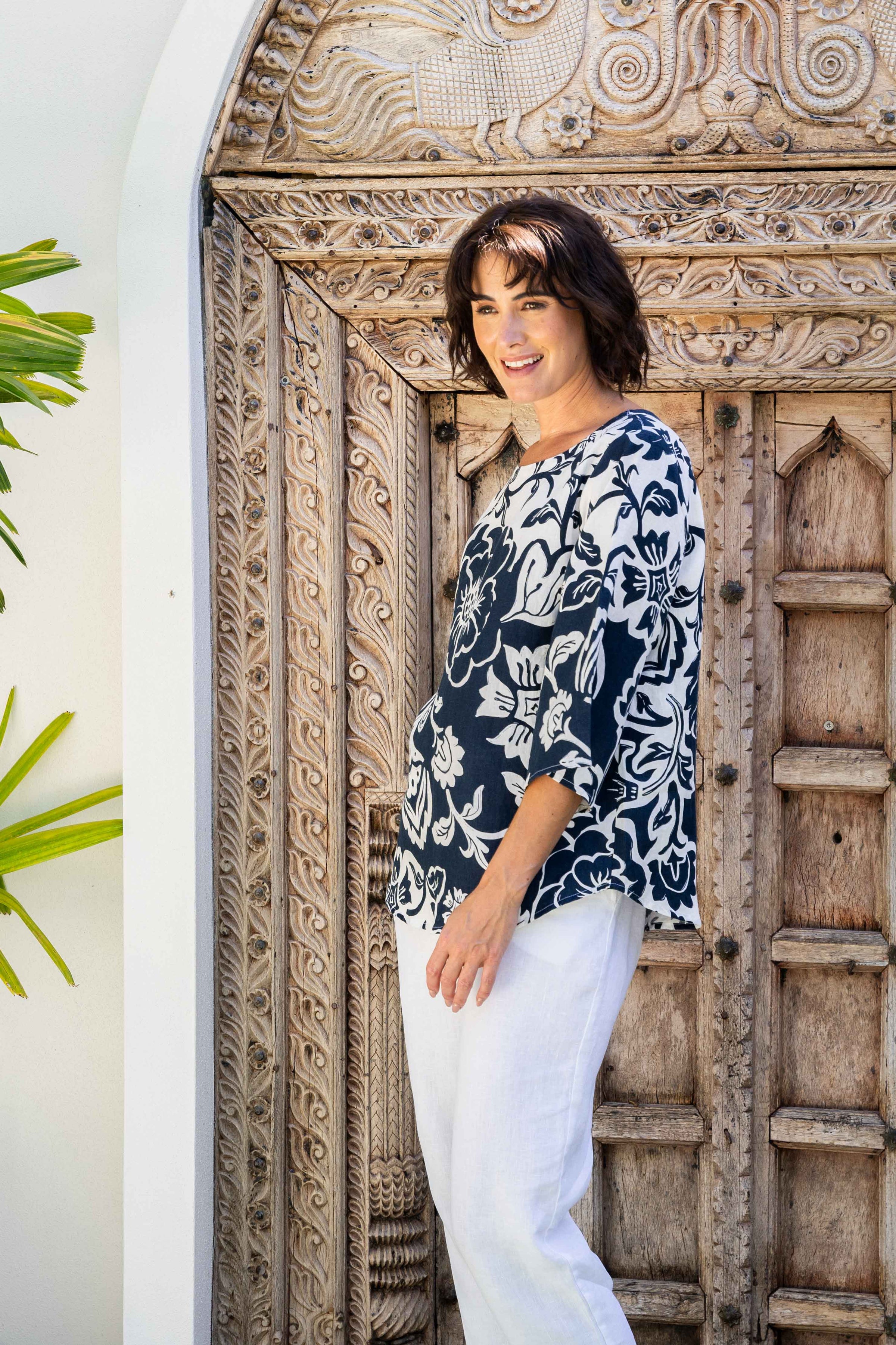 Linen top with boatneck and flaired sleeves