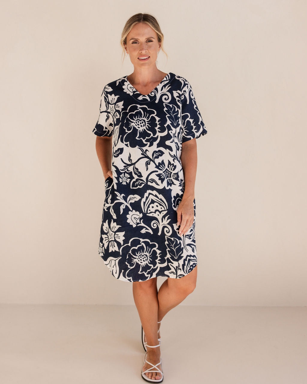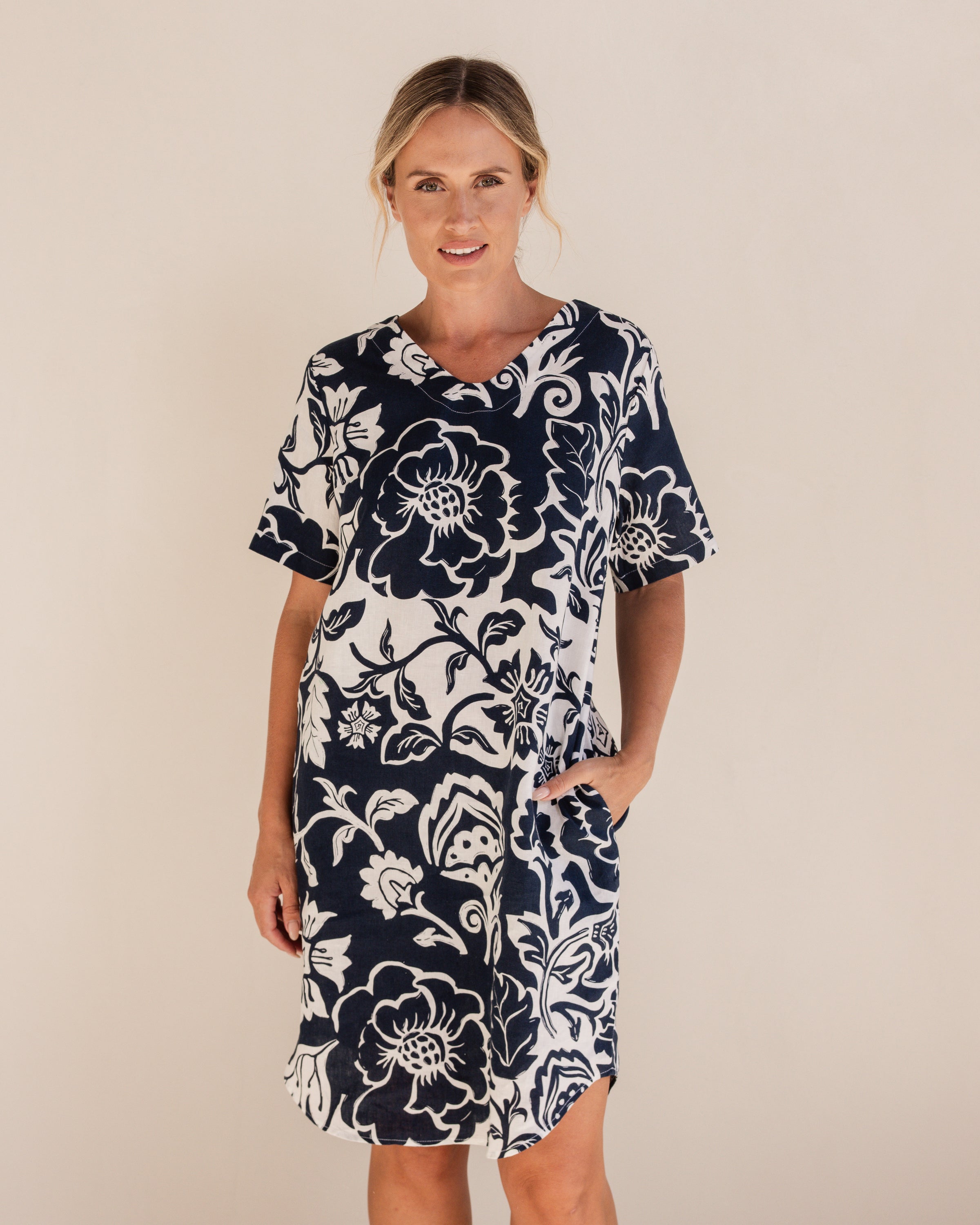 Linen shift dress with V neckline