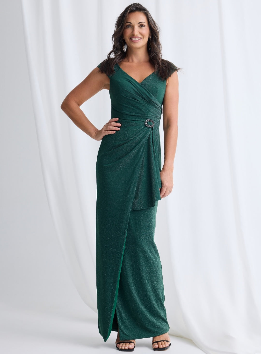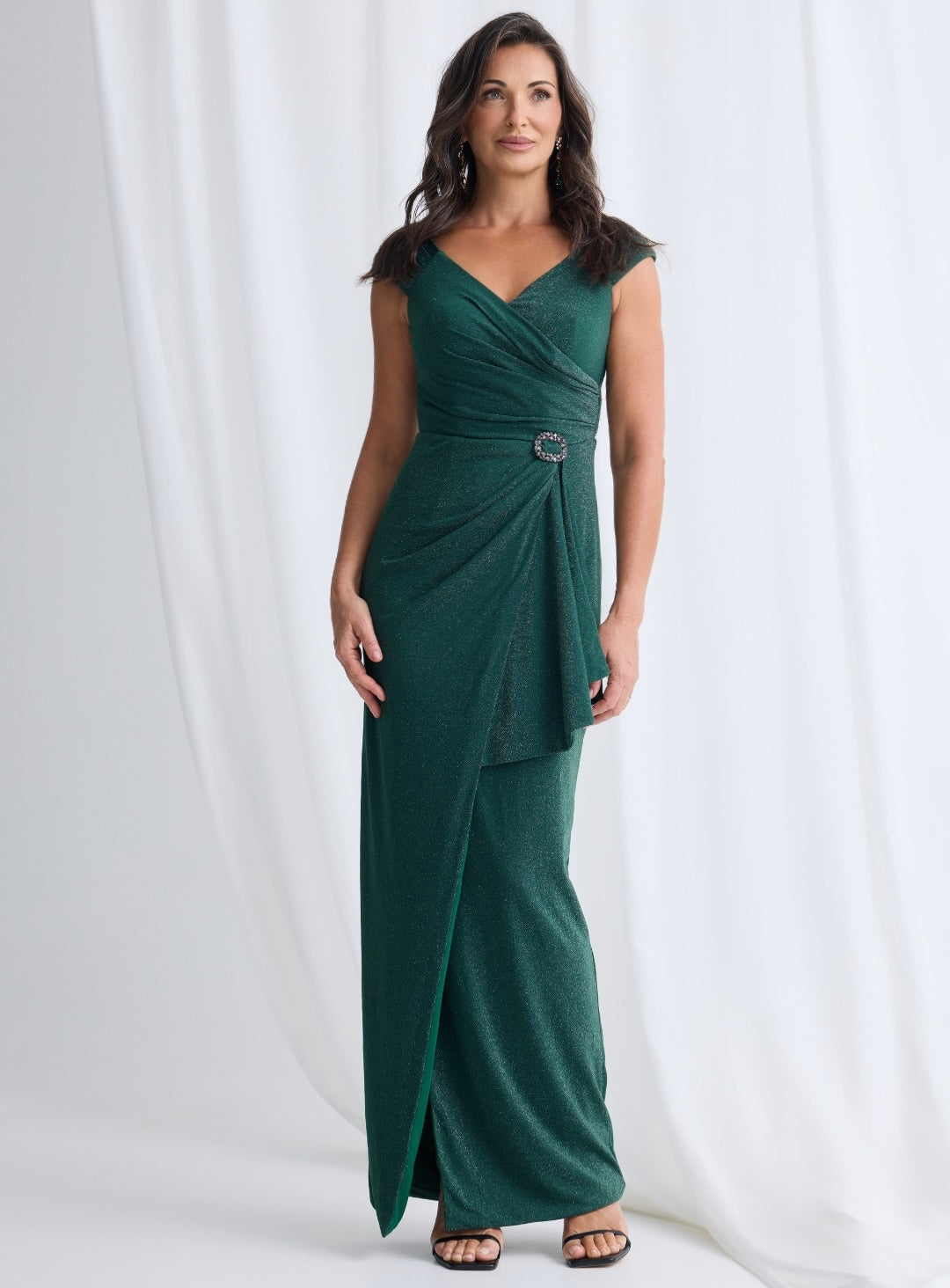 A gorgeous gown by Trellis Lane. A draped design with gathered cap sleeves and elegant ruching at the waist. The gown also has a zipper in the centre back, and is fully lined.