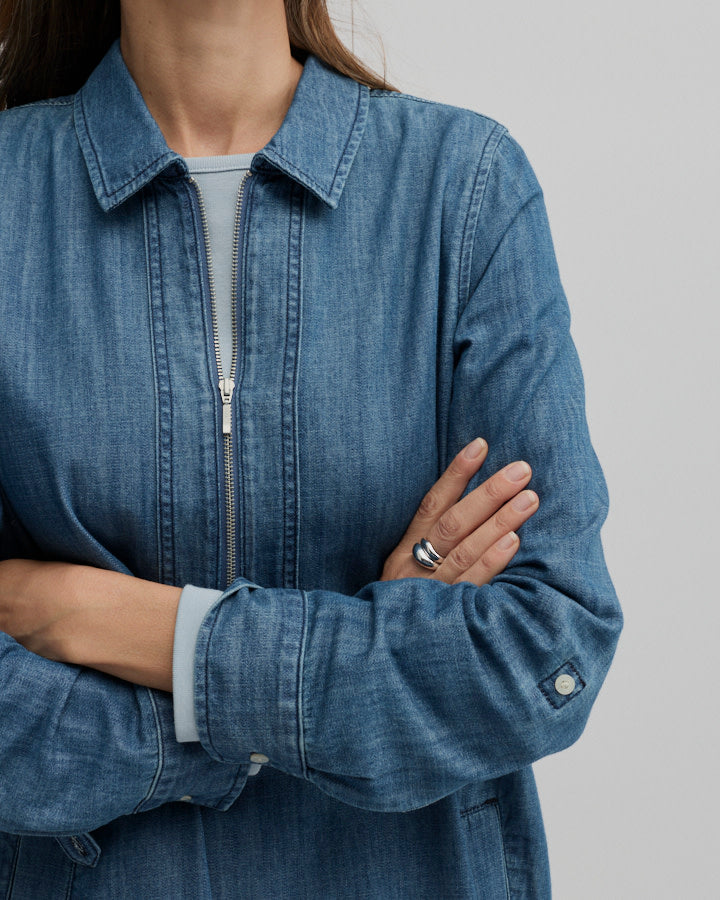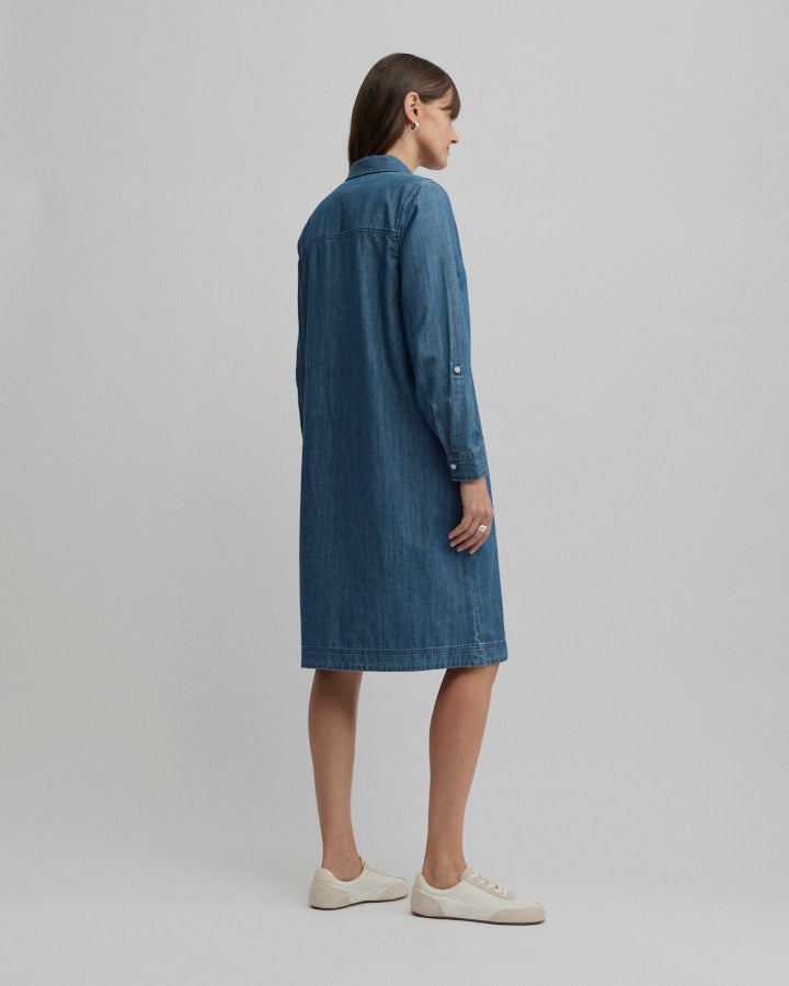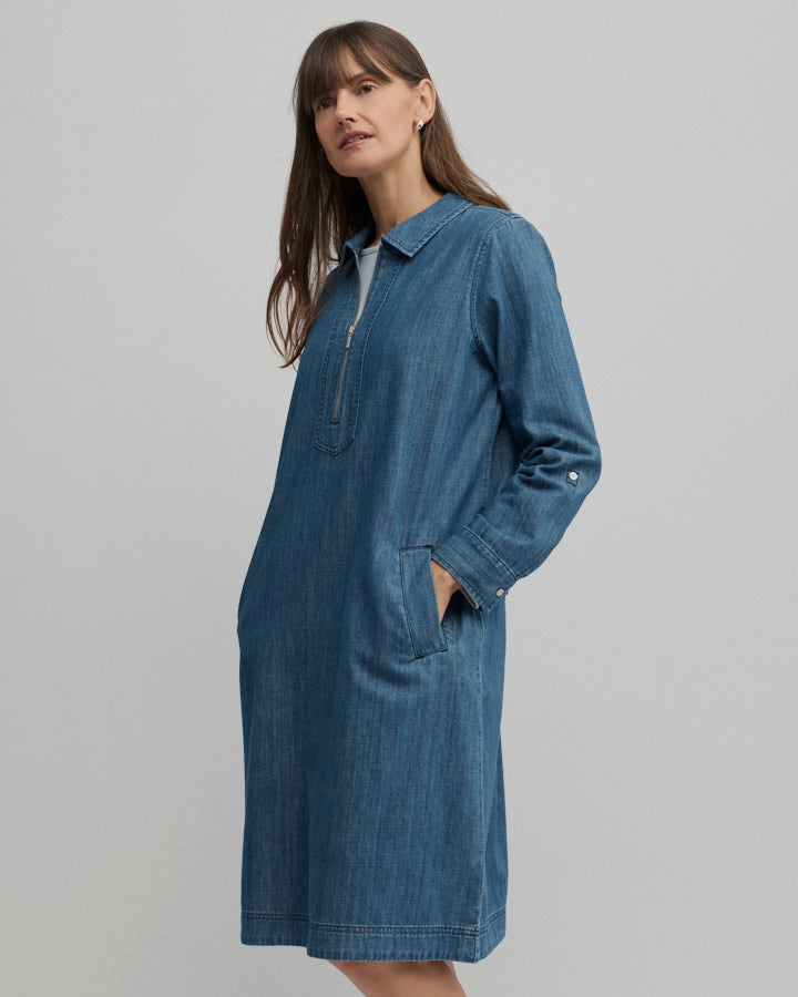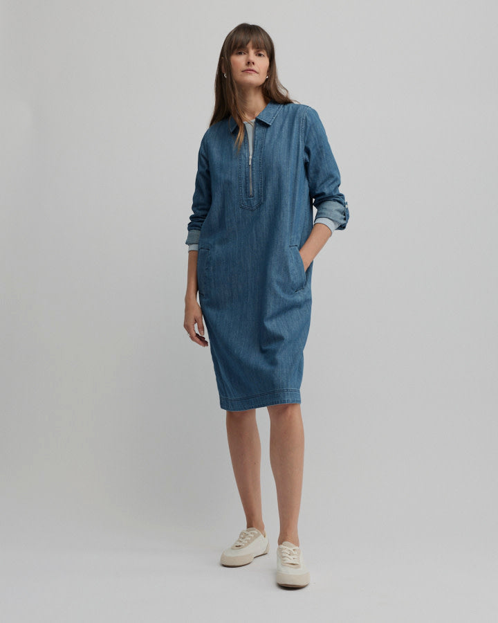 Crafted from lightweight cotton chambray, the Citrine Zip Dress delivers the ease of denim in a relaxed, modern silhouette. Designed as a shift style without a defined waist, it features a collared neckline, quarter zip front and tonal topstitching, balanced by rolled cuffs with sleeve tabs and practical welt pockets. Falling to a knee-length midi with a softly curved hem, it’s an effortless choice for workdays, travel and casual weekends alike.